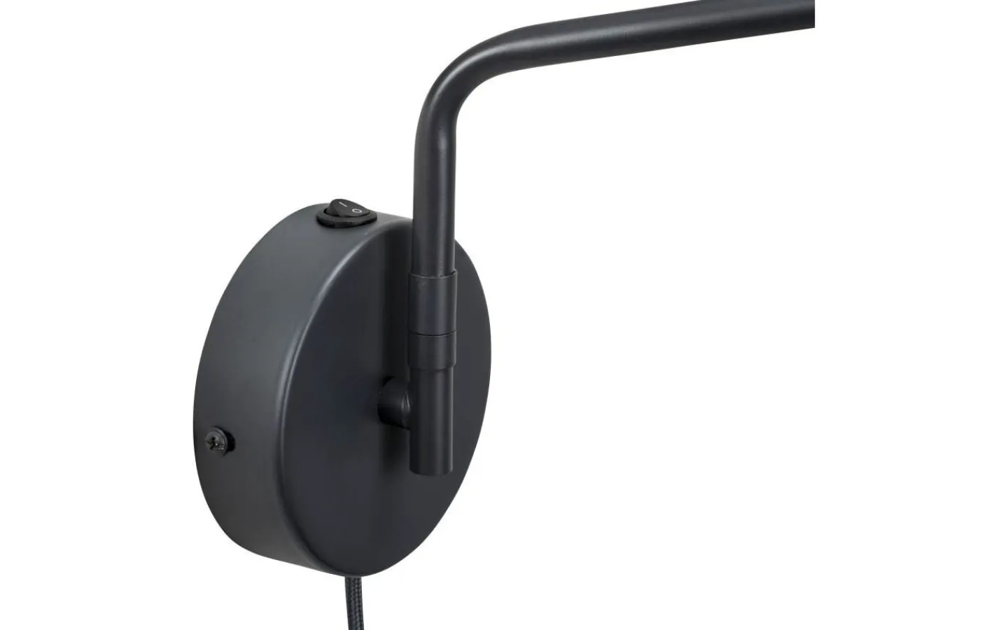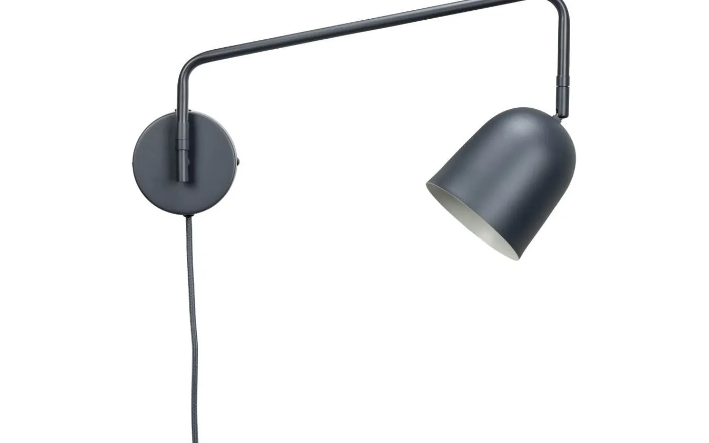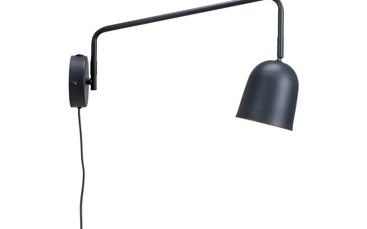 Manchester vägglampa. Armen kan vridas från sida till sida och lampskärmen kan lutas. På-av-brytaren finns på upphängningen. Lampan kan användas utan sladd om lampan monteras direkt på sockeln.