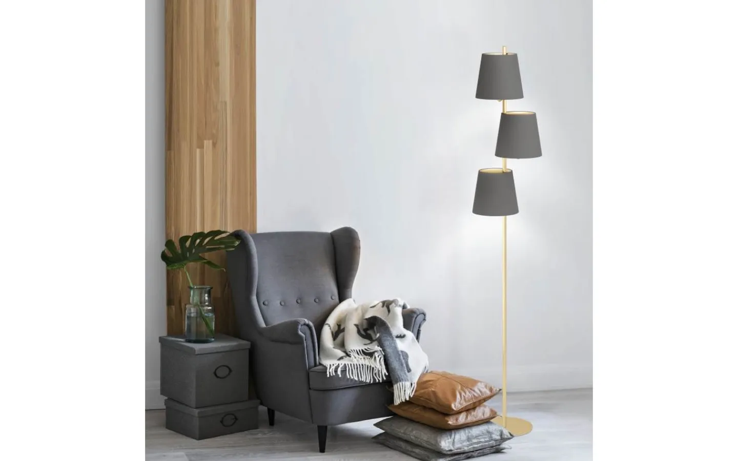 Golvlampan ALMEIDA 2 har en metallfot i borstad mässing, försedd med tre koniska tygskärmar i cappuccino. Med en inre finish i borstad mässing skapar nyanserna ett attraktivt utseende. Lampan kan enkelt tändas och släckas med hjälp av fotkontakten.