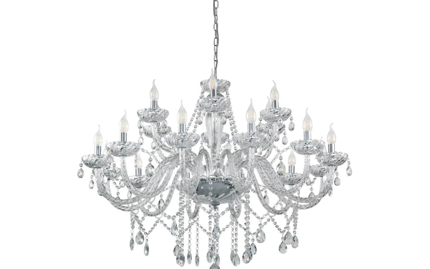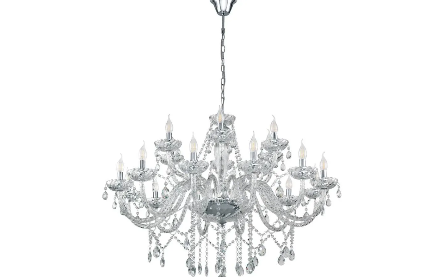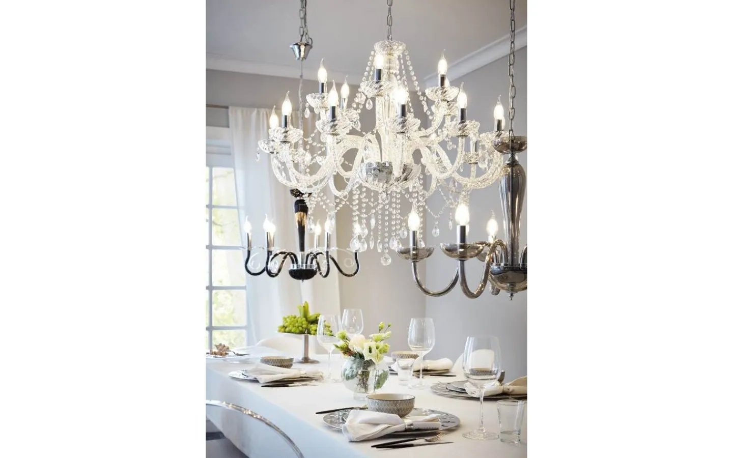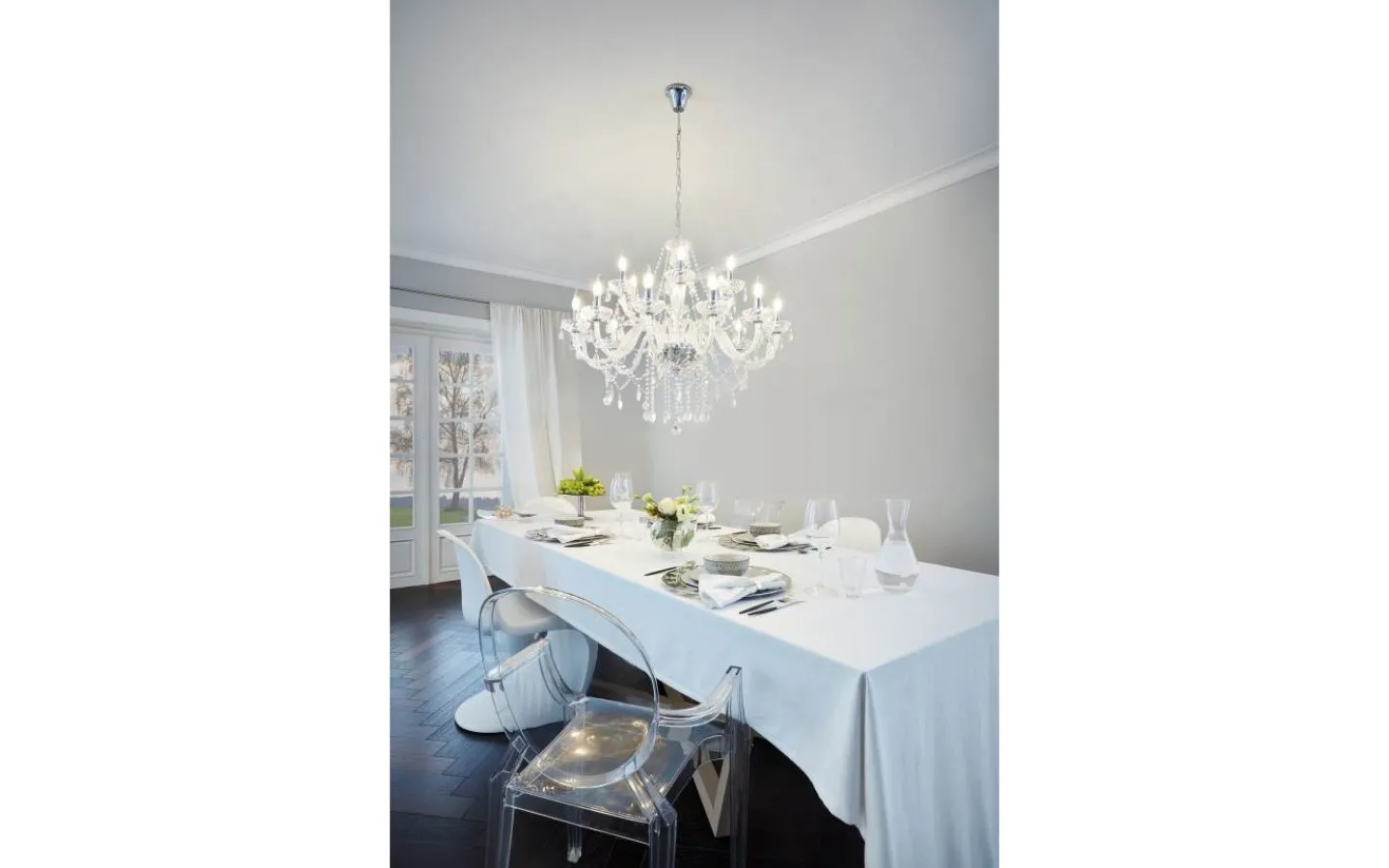 Denna nedpendlade armatur från serien BASILANO är gjord av förkromat stål och klart glas.