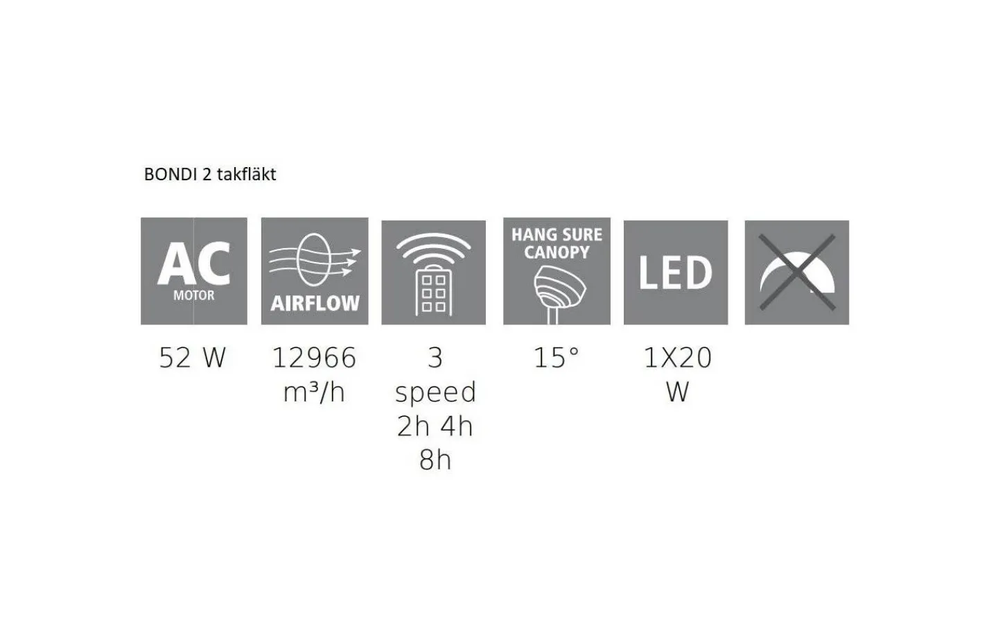 Bondi 1s tystlåtna motor är energisnål och låter dig styra fläkten i 3 olika hastigheter. Den är även reversibel så att du får ut det mesta av din takfläkt och kan ha nytta av den både under varma sommardagar och under kyliga vinterdagar. Du styr fläkten med medföljande fjärrkontroll, där du även kan ställa in timer.