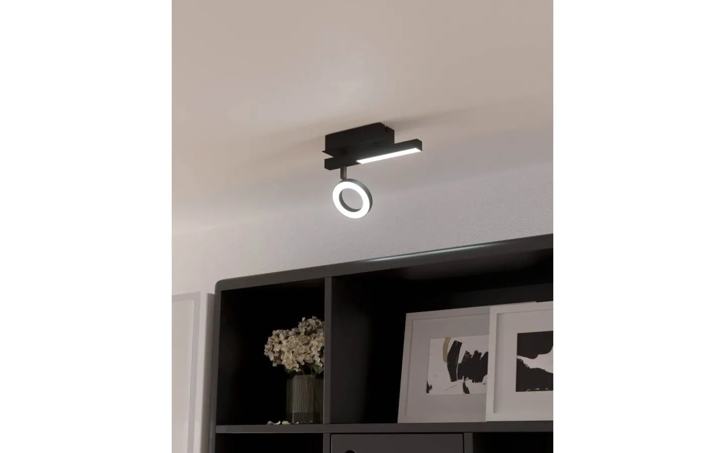 En elegant och modern svart armatur utrustad med en justerbar ringformad LED-lampa. Perfekt för moderna miljöer, den har en kraftfull 2,2W huvudljus med en färgtemperatur på 3000K och en extra 3,2W spotlight, vilket ger både omgivande och fokuserad belysning. Perfekt för att belysa konstverk eller förbättra arbetsplatsens belysning, dess minimalistiska design smälter sömlöst in i alla inredningar.