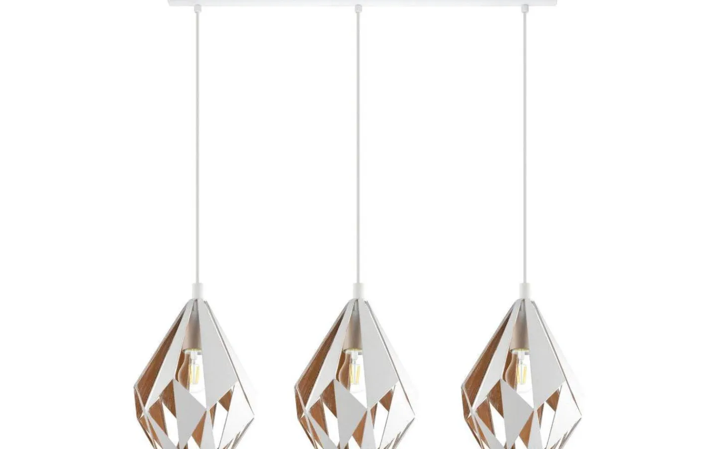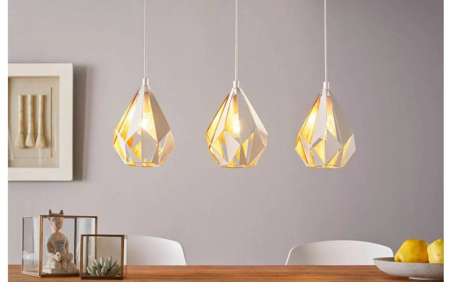 Carlton taklampa från Eglo är en avlång taklampa med tre nedpendlade skärmar i vit stål med guldfärgad insida som skapar en härlig ljusreflektion.