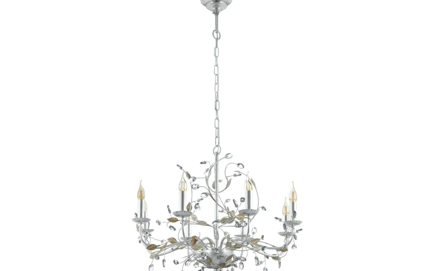 Denna pendelarmatur från serien FLITWICK 1 är gjord av silverstål och behöver åtta E14-lampor för att lysa.