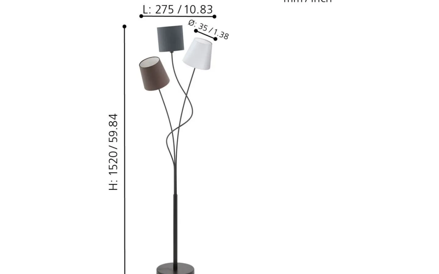 MARONDA golvlampan har en svart böjd metallfot och tre tygskärmar – en antracit, en vit och en brun. Designen har olika formade lampskärmar för att skapa ett attraktivt, välbalanserat utseende. Lampan tänds och släcks enkelt med hjälp av den inbyggda golvströmbrytaren. Med sin moderna design ger denna golvlampa mysig belysning för alla utrymmen, oavsett om det är i sovrummet, vardagsrummet eller matsalen.