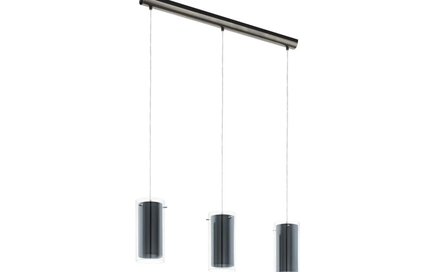 Pendellampan PINTO TEXTIL har tre cylindriska lampskärmar av glas upphängda i ett tak av matt nickel. De inre lampskärmarna i grått tyg låter ljuset skina igenom. Designen fungerar bra med nästan alla inredningsstilar och kommer att skapa den rätta stämningen i alla utrymmen, oavsett om det är i vardagsrummet eller över ett långbord i matsalen.