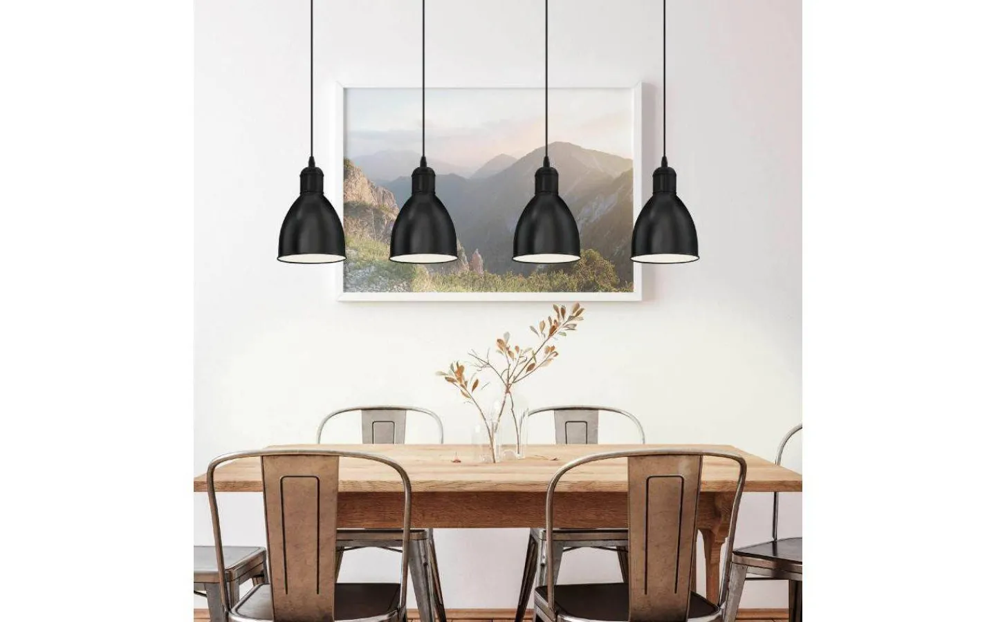 Priddy taklampa från Eglo är en avlång taklampa med fyra nedpendlade lampskärmar i stål med mattsvart finish. Observera att denna produkt skruvas upp och har en fast anslutning, den går ej att montera på en takkrok.