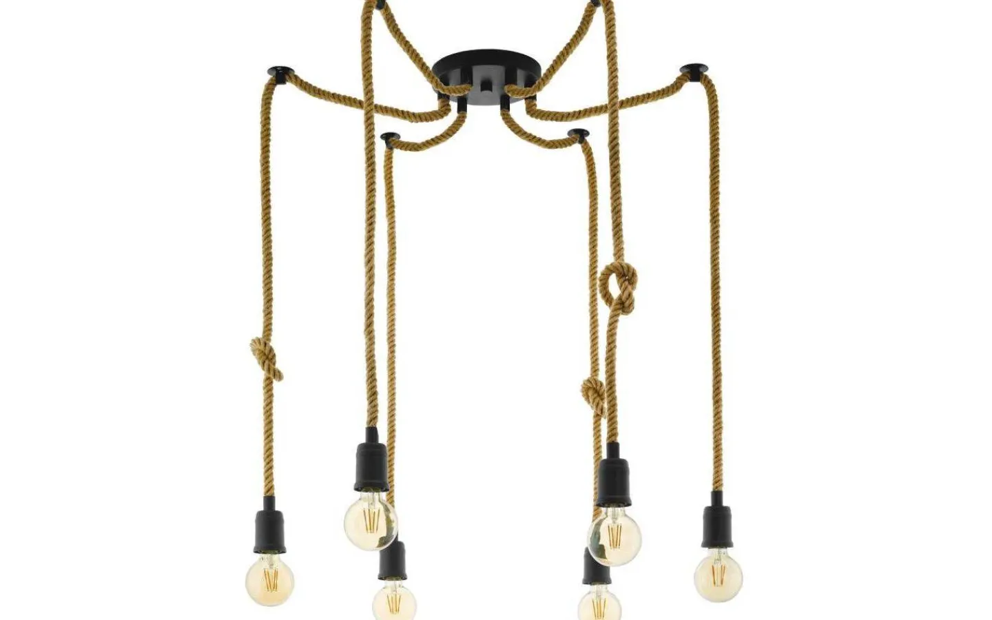 Rampside taklampa från Eglo är en tuff taklampa som består av en central takbas med sex pendlar av hampasnöre med lamphållare i svart stål. Den svarta takkoppen fäster du direkt i taket och du bestämmer själv vart de olika sladdarna ska hänga (metallfäste till varje sladd som skruvas upp).