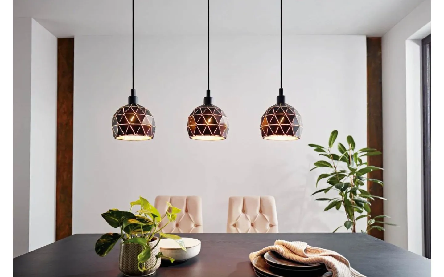 ROCCAFORTE taklampa har tre runda svarta metalllampskärmar, var och en med en geometrisk design och en inre guldfinish. De triangulära utskärningarna skapar ett fascinerande spel av ljus och skugga när ljuset är på. Denna taklampa kompletterar moderna och skandinaviska inredningsstilar och skapar iögonfallande belysning i alla utrymmen, oavsett om det är i vardagsrummet eller över ett långbord i matsalen.