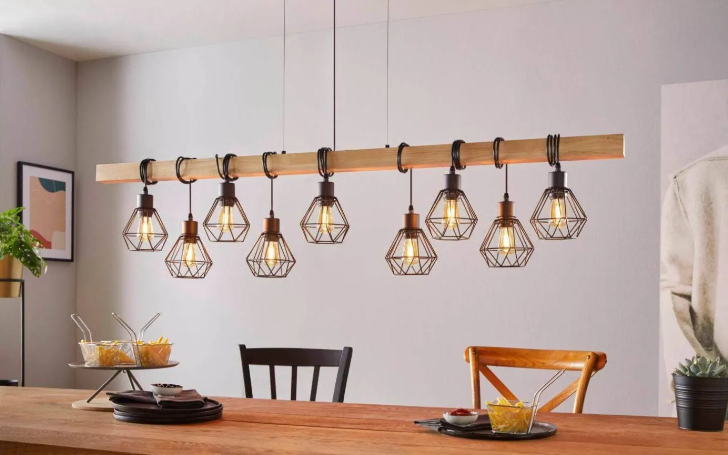 Tuffa Townshend taklampa från Eglo är en taklampa med en touch av retrodesign. Taklampan har en bas av stål hängadnes ner en ramp av trä med 9st virade sladdställ med diamantformade skärmar av svartlackerat stål. Matcha med en dekorativ ljuskälla och få dig en riktig ögonfångare!