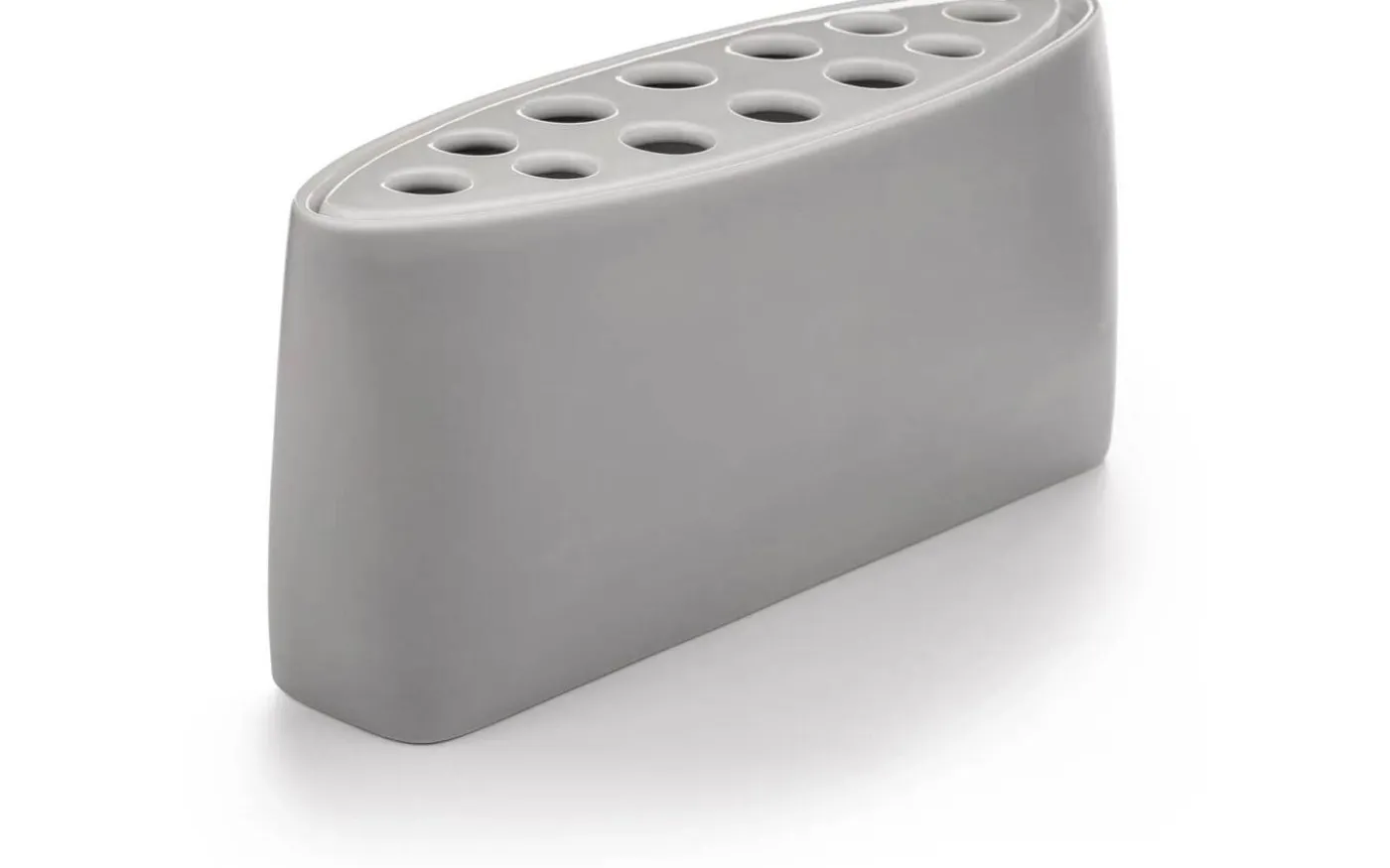Grå funktionell vas i oval form med avtagbart lock. Matt vas och blankt lock ger en modern känsla. I locket finns 12 hål för blommor. Höjd 16cm, bredd 37cm. Gjord av keramik. Tillverkad i Europa. Designad av Emelie Grönvall.