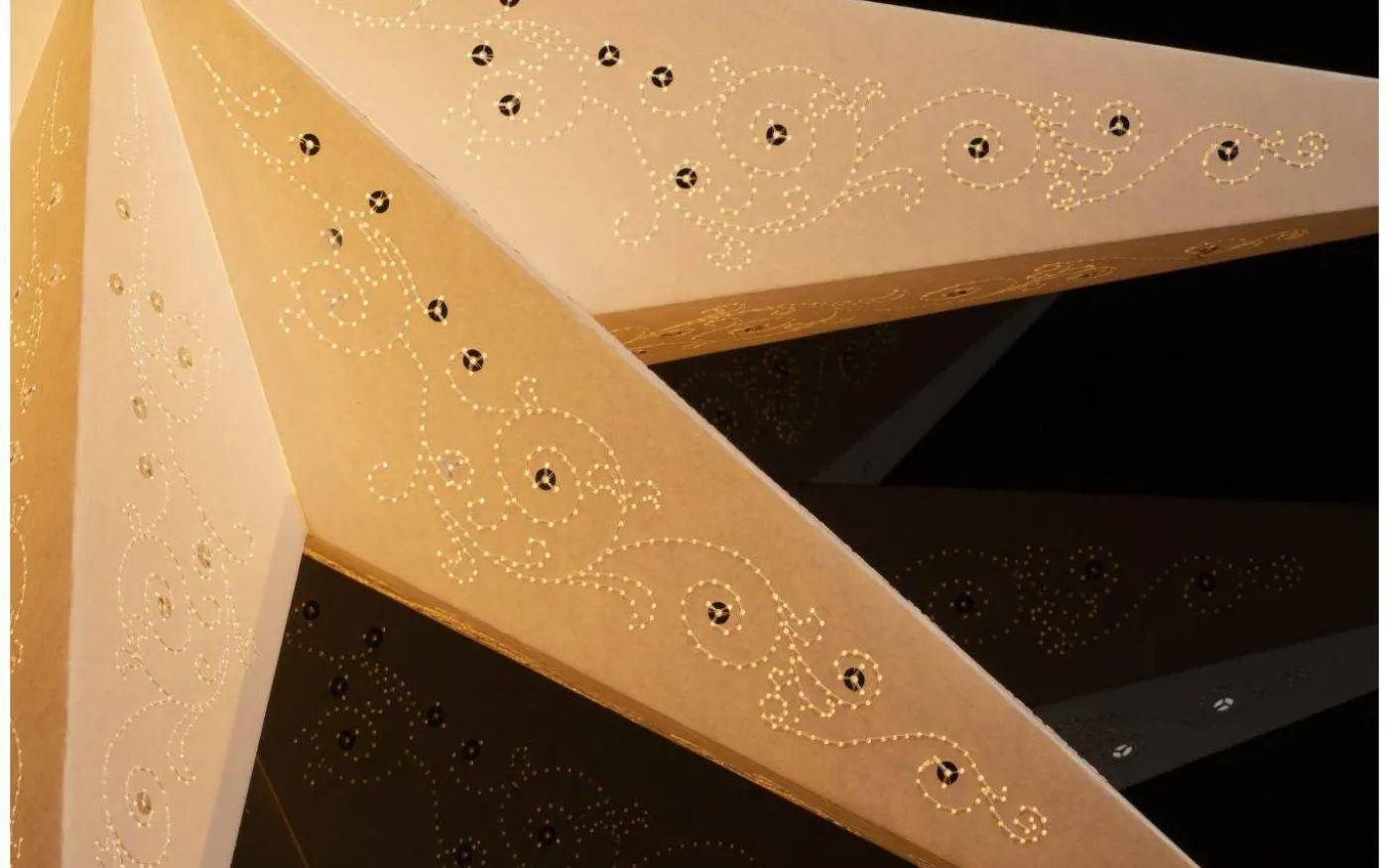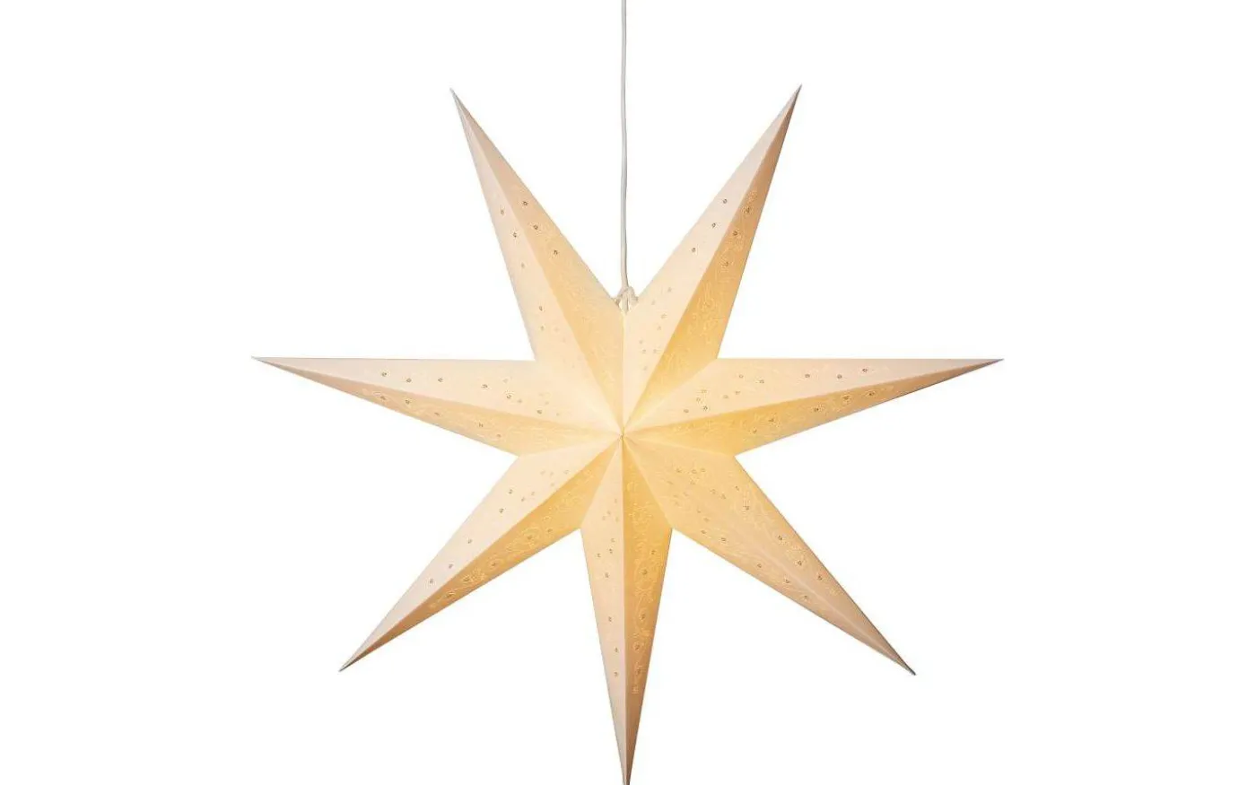 Elise julstjärna från Konstsmide är gjord i papp. Det fina utstansade mönstret gör att stjärnan släpper genom ett mysigt ljusflöde.