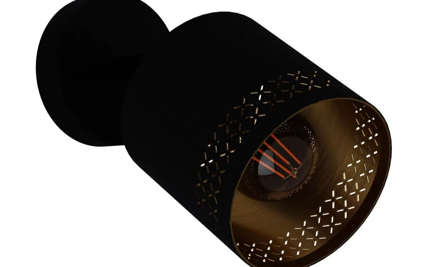 ESTEPERRA vägg- och taklampa är gjord av svart metall och har en justerbar spotlight i svart tyg med ett inre guldfoder. De små utskärningarna runt lampskärmens kant skapar ett fascinerande spel av ljus och skugga så fort ljuset tänds. Den väggmonterade spotlighten smälter in i nästan vilken heminredning som helst och kan användas som taklampa. Det vridbara huvudet låter dig justera ljuset för att accentuera enskilda delar av rummet, oavsett om det är i vardagsrummet, sovrummet, hallen eller matsalen.
