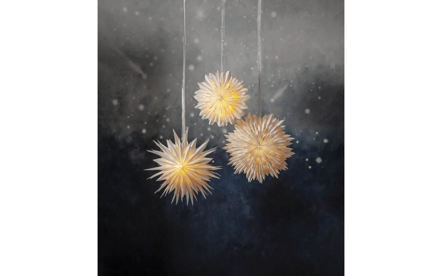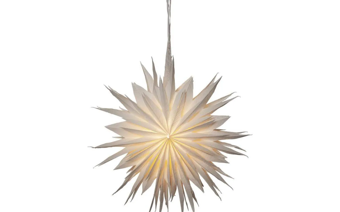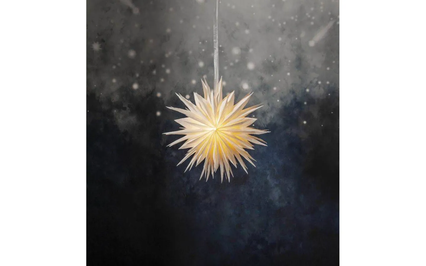 Cloud julstjärna från Star Trading är en magisk pappersstjärna med två lager veckat papper som är tillverkat av återvunnen bomullsspill från t-shirt tillverkning. Strukturen i pappret är mjukt och i själva pappret ser man vattenstämplade prickar. Konturen är flikig för en vintrigare känsla. Ett elegant band medföljer för att lättare kunna hänga upp stjärnan.