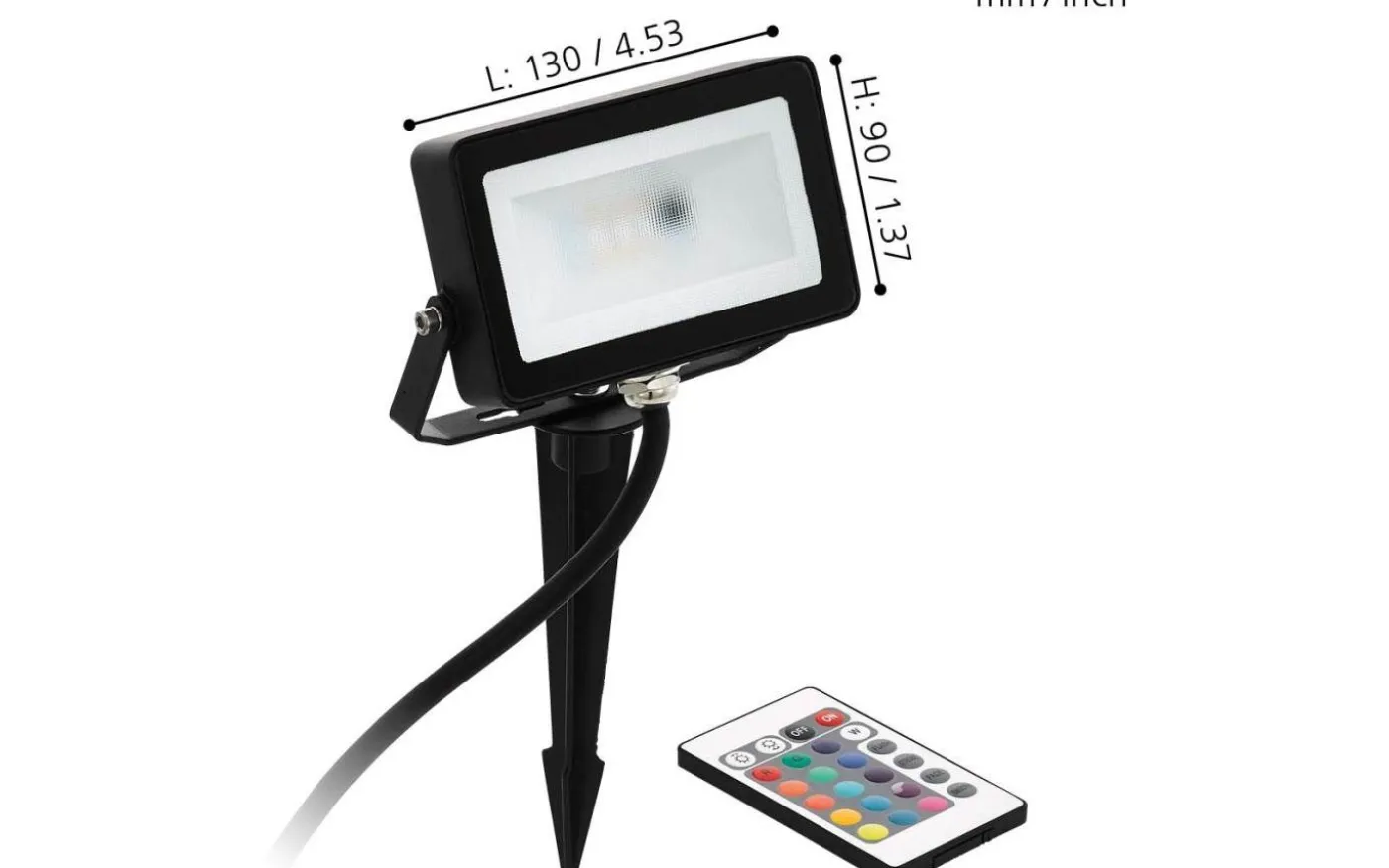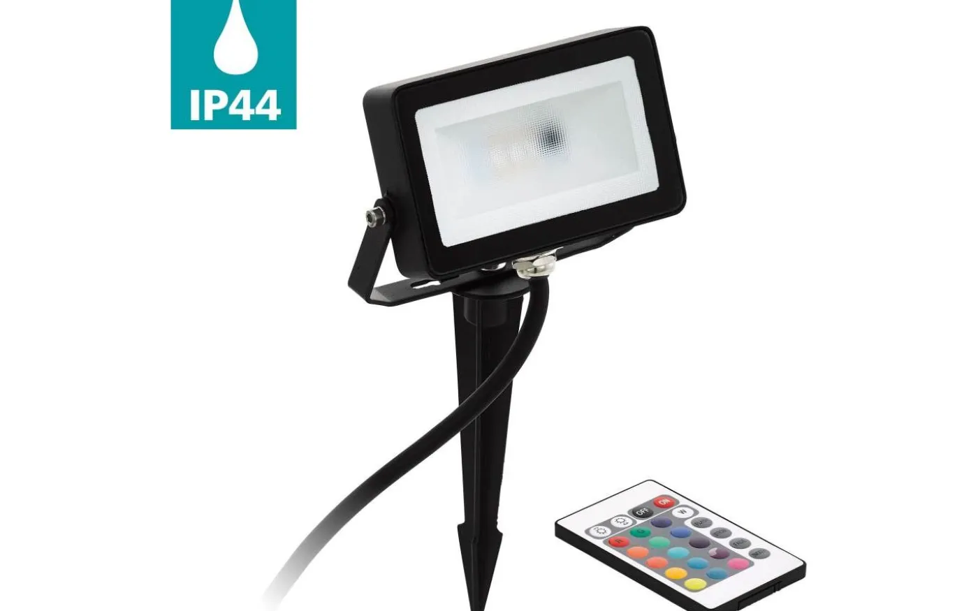 FAEDO 4 exteriör LED-trädgårdslampa är gjord av svart aluminium och har ett rektangulärt huvud. Huvudet fästs i marken med hjälp av en spik och kan svängas uppåt och nedåt. De integrerade lysdioderna bakom den klara plastpanelen ger ett behagligt ljus som kan justeras efter behov. Fjärrkontrollen används för att växla mellan olika RGB-färger, justera ljusstyrkan och välja olika ljuslägen. Med IP44-skydd mot sprutvatten är lampan lämplig för utomhusbruk. Markspetsljuset är idealiskt för att ge indirekt belysning i trädgården. Produktburken används för att skapa individuell accentbelysning, belysande funktioner som väggar, gräsmattor, växter och vägar. Ytterljuset ansluts via en kontakt på kabeln.