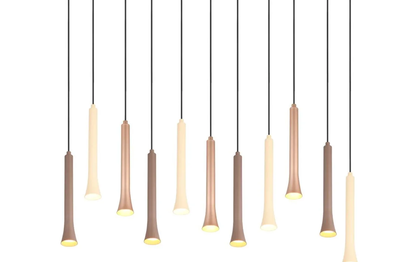 FIATO-pendellampan är mycket mer än bara en ljuskälla – den är ett imponerande designstycke som förvandlar vilket rum som helst till ett sant konstverk. Den ser ut som en samling svävande instrument skickligt arrangerade i luften. Denna extraordinära design ger den ett elegant men ändå dynamiskt utseende som smälter in i både moderna och klassiska inredningsstilar. Med sina 11 lågor erbjuder FIATO inte bara estetisk skönhet, utan även funktionell belysning. Tack vare den integrerade SWITCH-dimmern kan du styra ljusstyrkan i tre nivåer direkt via den vanliga ljusströmbrytaren. Detta ger dig full kontroll över ljusintensiteten och låter dig justera ljuset efter stämning eller tid på dagen. Med DIP-SWITCH kan du ställa in ljusfärgen direkt på armaturen via en strömbrytare. Den är särskilt effektiv som ett centralt belysningsobjekt i stora rum. Oavsett om det är i vardagsrummet, matsalen eller i en rymlig entré – FIATO-pendellampan ger både ljus och elegans till alla miljöer. Dess färgschema är lika fascinerande som dess design: i varma kaffe- och beigetoner skapar den en mysig och inbjudande atmosfär. Dessutom använder armaturerna modern LED-teknik, vilket står för hög ljuskvalitet. LED-ljuskällor kännetecknas av lång livslängd och låg värmeutveckling. Ljuskälla: inklusive 11x SMD, 3W · 11x 400lm, 2300+3000+4000K. Extra information: Justerbar i höjd, Justerbar ljusfärg, Takmontering, Färger direkt justerbara på lampan, IP20, Ej lämplig för extern dimmer, Dimbar via strömbrytare