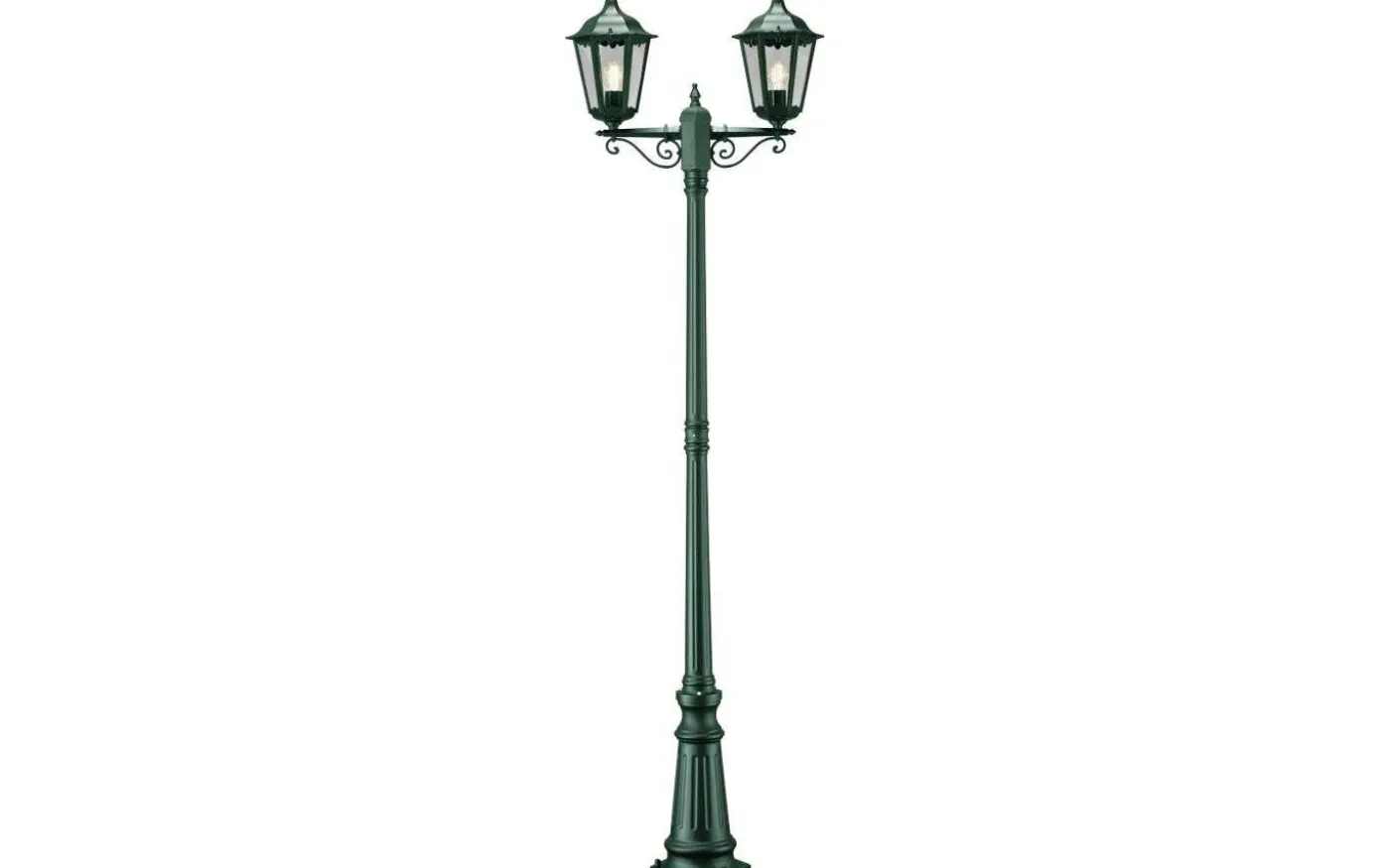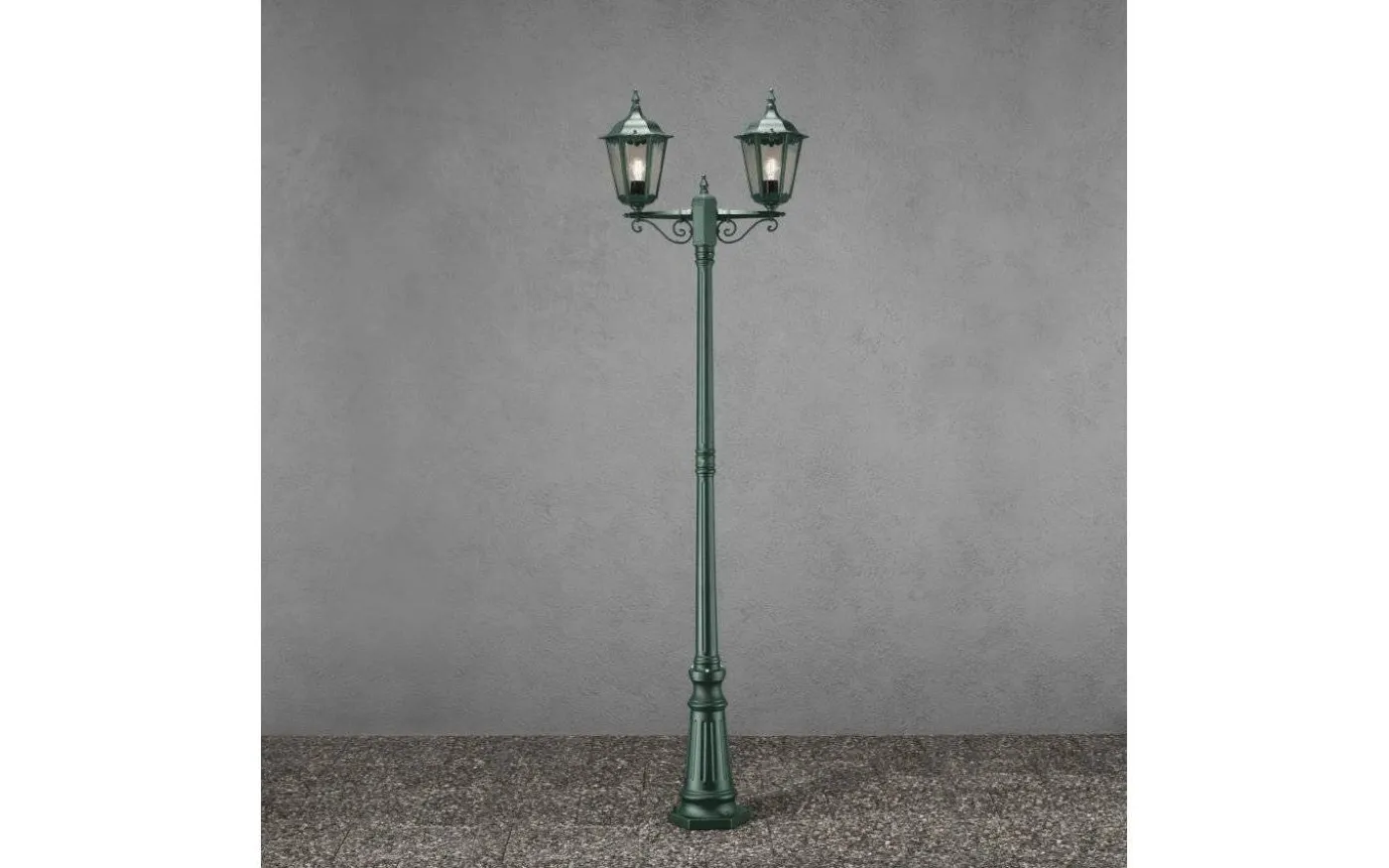 Stolplyktan är 2,2 meter hög, gjord i grön aluminium och har en en vacker tvåarmad lykta med klarglas.