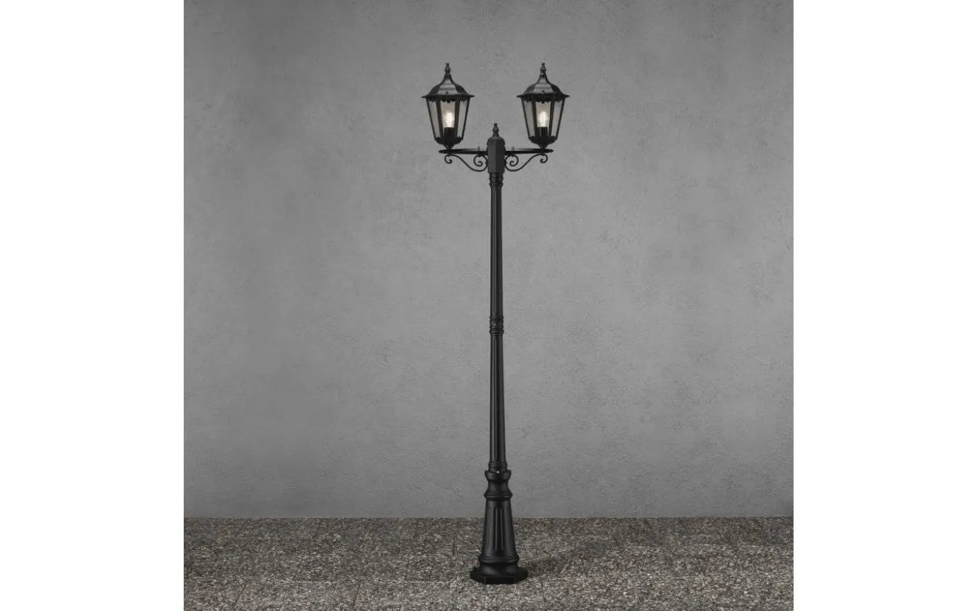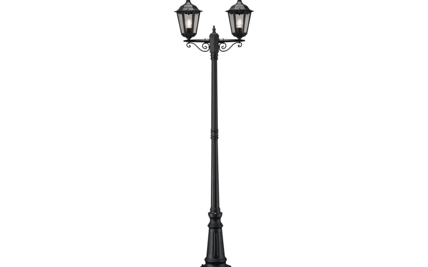 Stolplyktan är 2,2 meter hög, gjord i svart aluminium och har en en vacker tvåarmad lykta med klarglas.