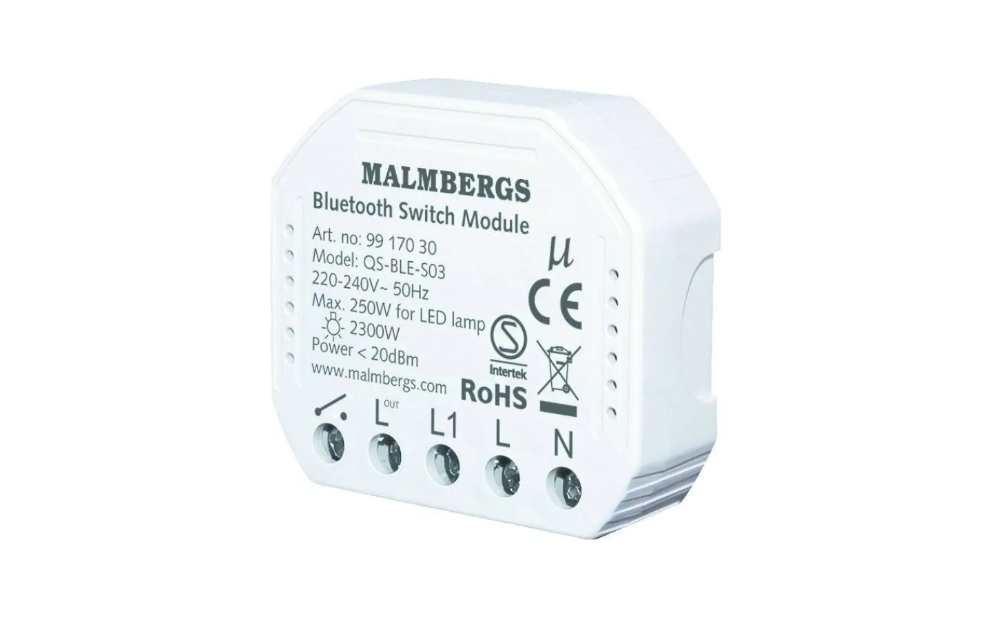 Bluetooth Smart Modul ansluts och styrs via Malmbergs app. (Sök ”MALMBERGS” i Google Play eller App Store). Fjärrstyr sedan din belysning/apparater var du än befinner dig. Schemalägg styrningen av din belysning/apparater utifrån dina rutiner. Stöd för röststyrning med Google Home samt Amazon Alexa. OBS! Bluetooth gateway 9919042 krävs för användning av vissa funktioner, se tabell. För montering i apparatdosa.
