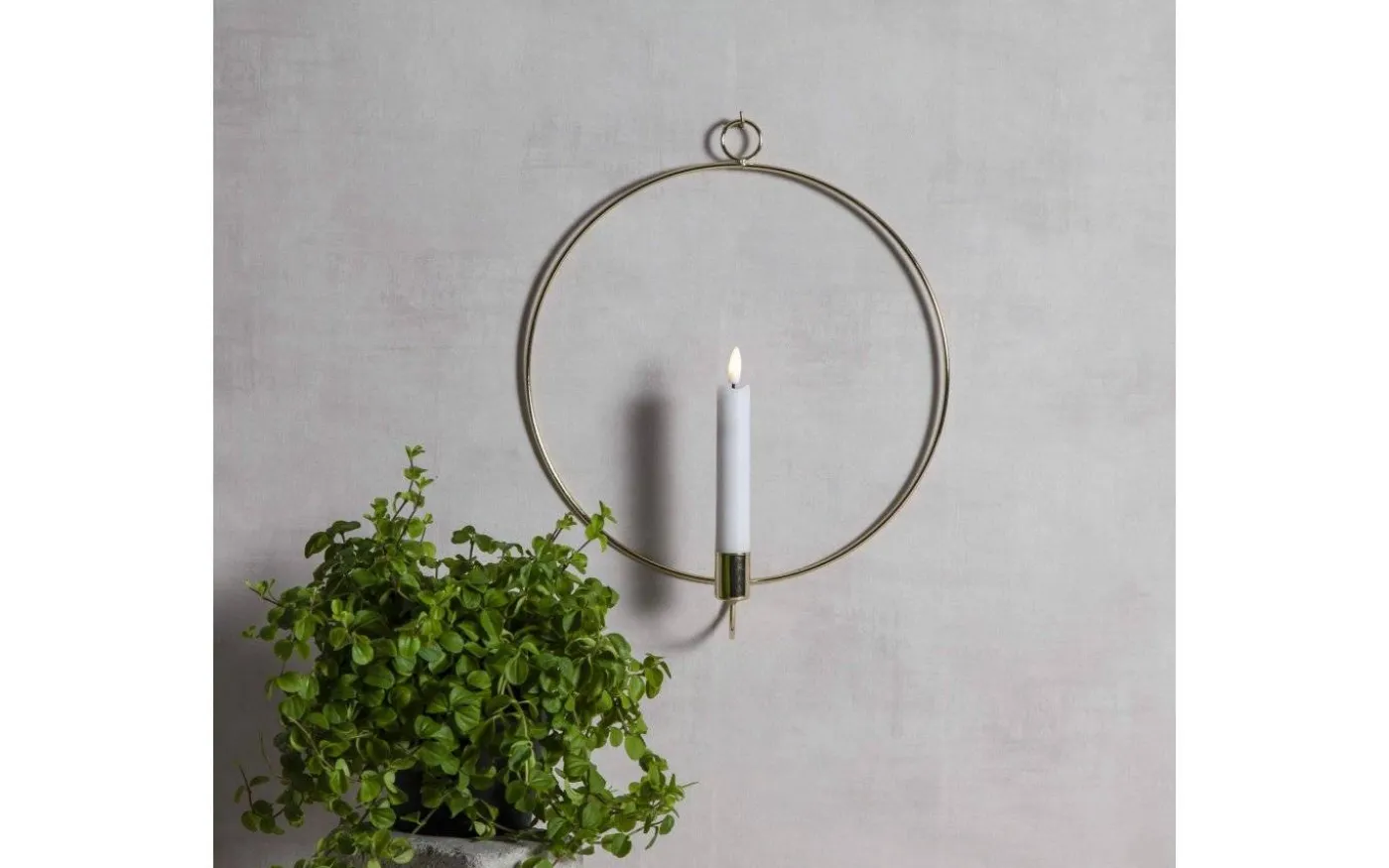 Flamme väggdekoration från Star Trading är av metall med en mässingsfärgad finish och ett dekorativt batteridrivet antikljus.