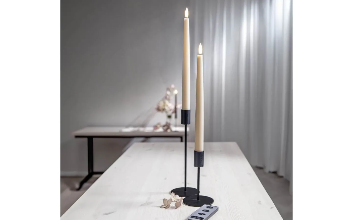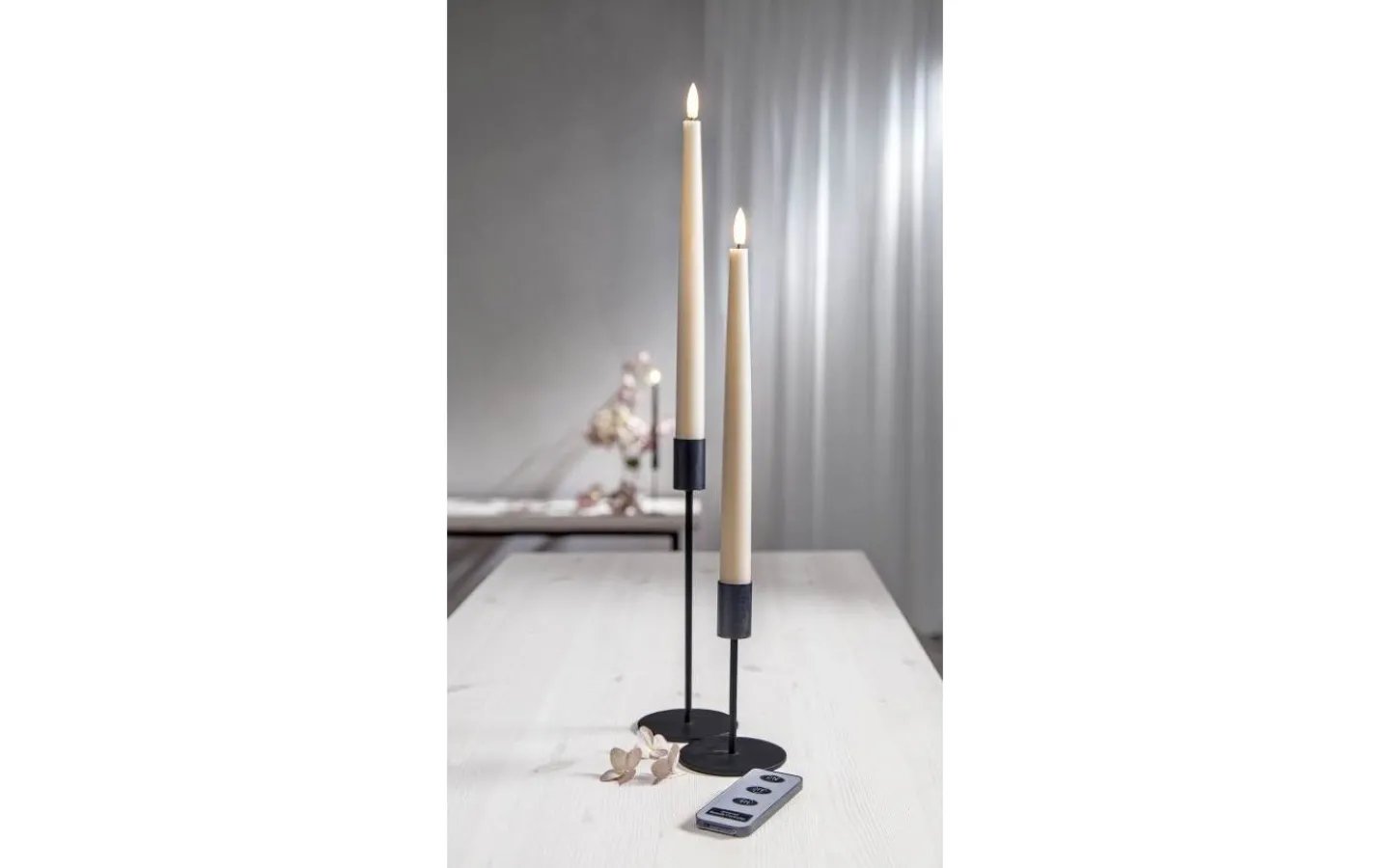 Detta är ett 2-pack med ljus som är 28,5 cm långa samt en fjärrkontroll som gör att du enkelt kan tända och släcka ljusen. Fjärrkontrollen har även en knapp för timerfunktion, trycker du på denna så lyser ljusen i 6 timmar och tänds igen samma tidpunkt dagen efter. Dessa ljus är 2,1 cm i diameter över bredaste punkten.