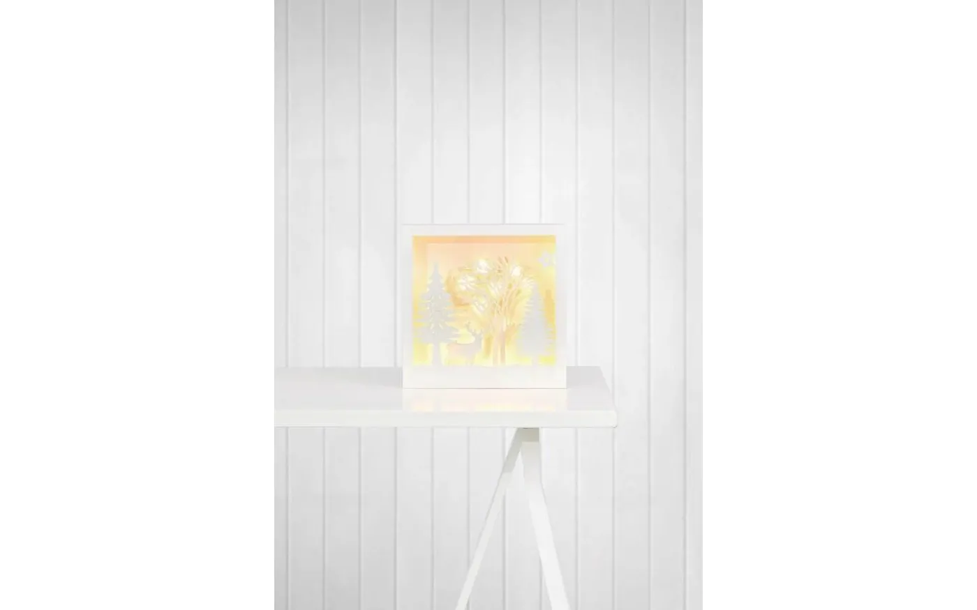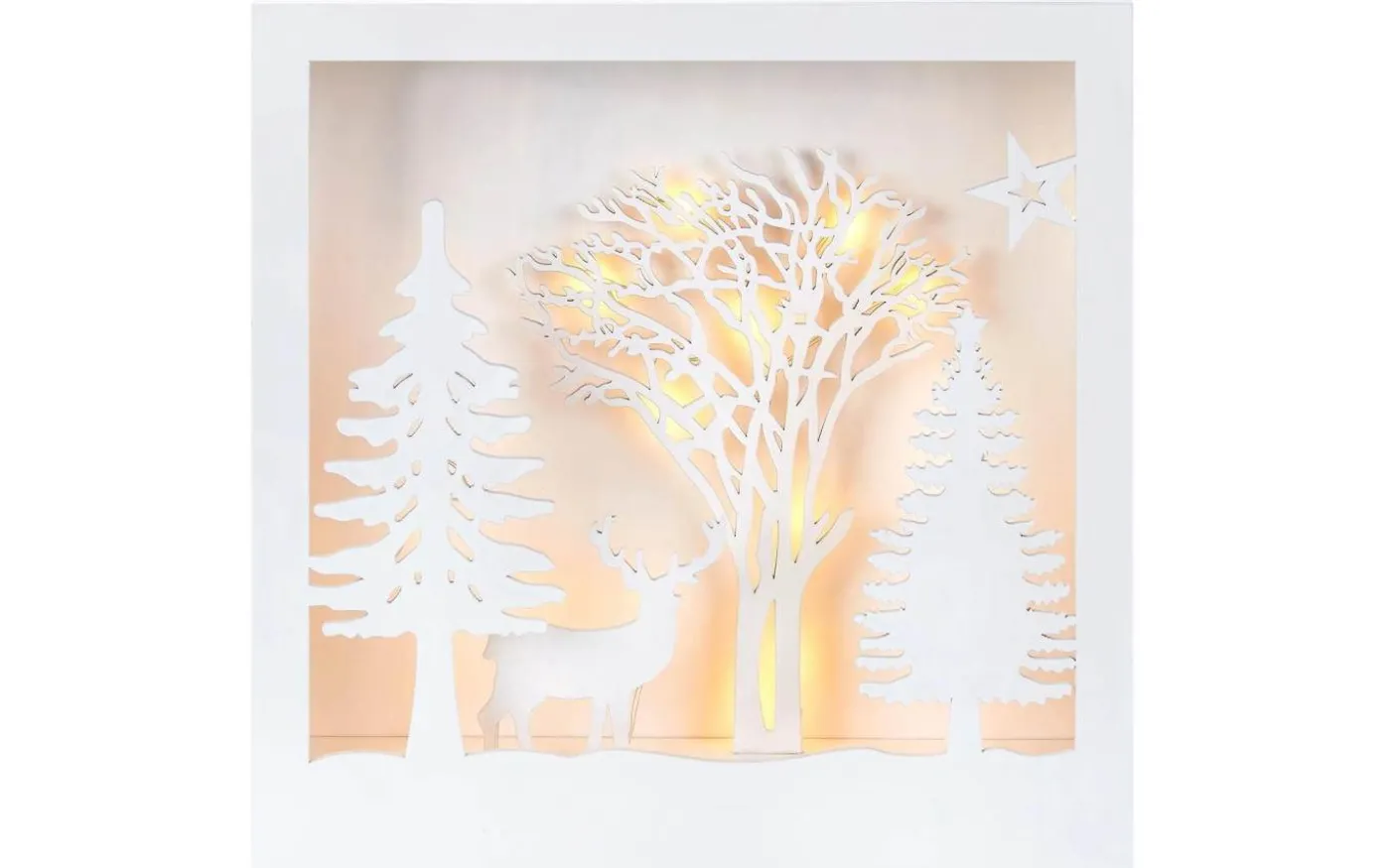 Vacker juldekoration i trä med silhuetter som avbildar granar, ett träd och en ren. Bakom silhuetterna lyser ett behagligt ljus bakom trädet som ger en otroligt vacker effekt.