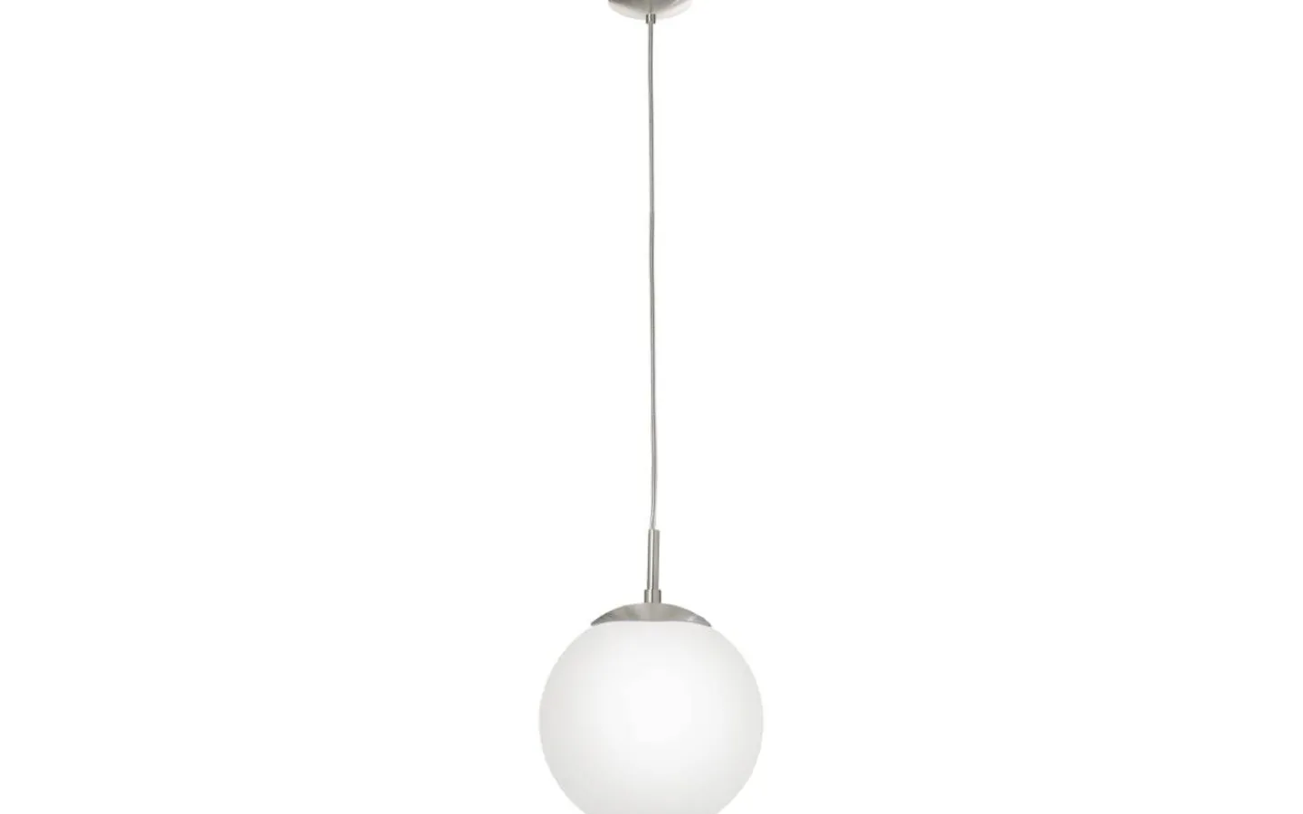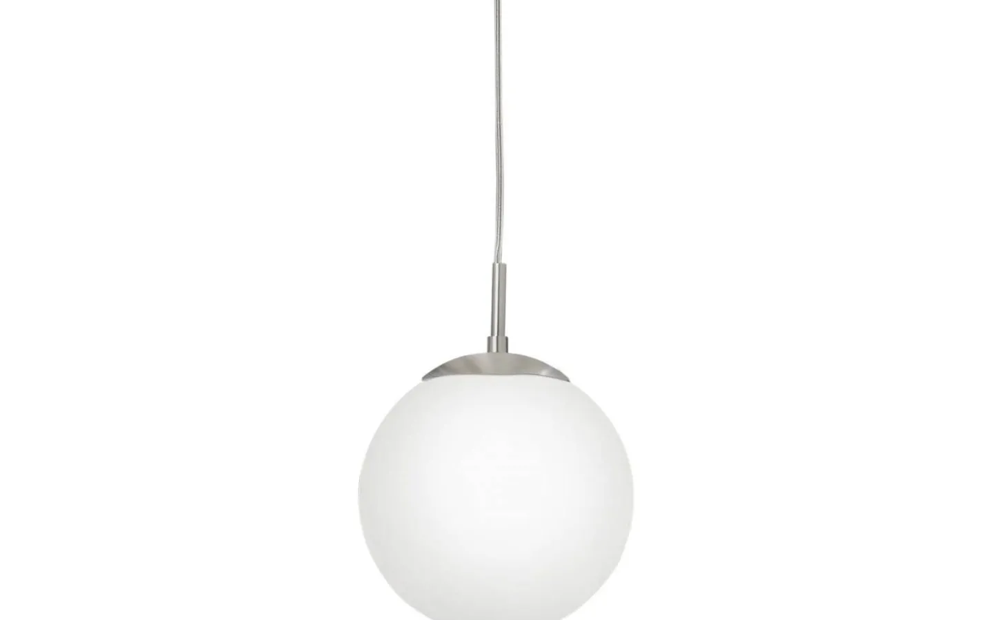 RONDO taklampa har en vit, matt opalglaskula upphängd i en rund skärm i satin-nickelmetall. Med sin enkla design smälter taklampan sömlöst med olika inredningsstilar och ger mysig belysning för ditt hem, oavsett om det är i vardagsrummet eller matsalen.