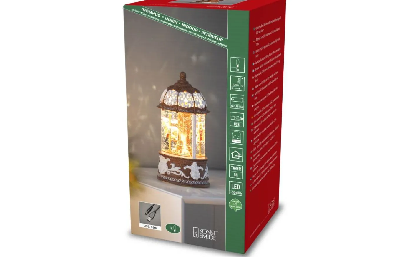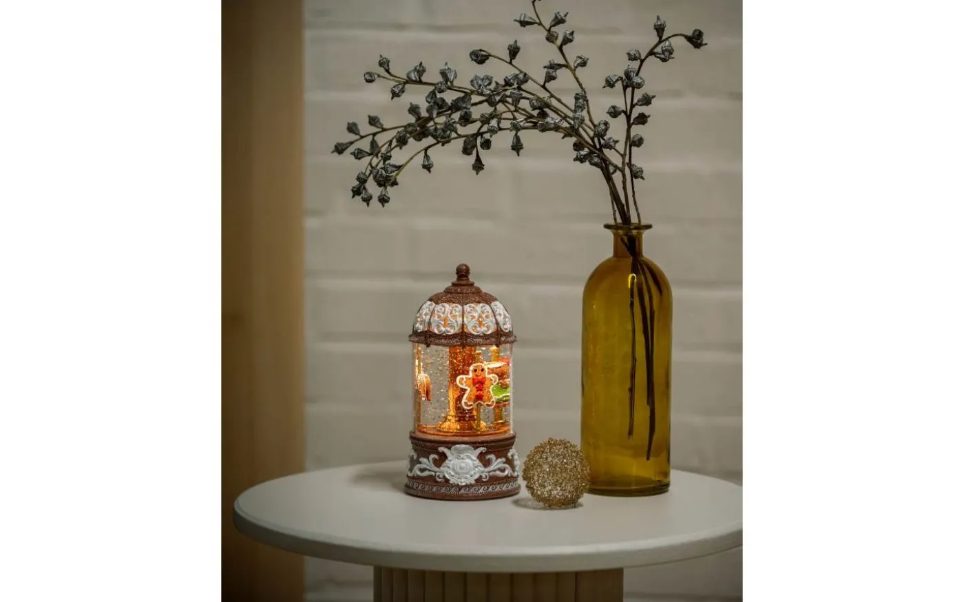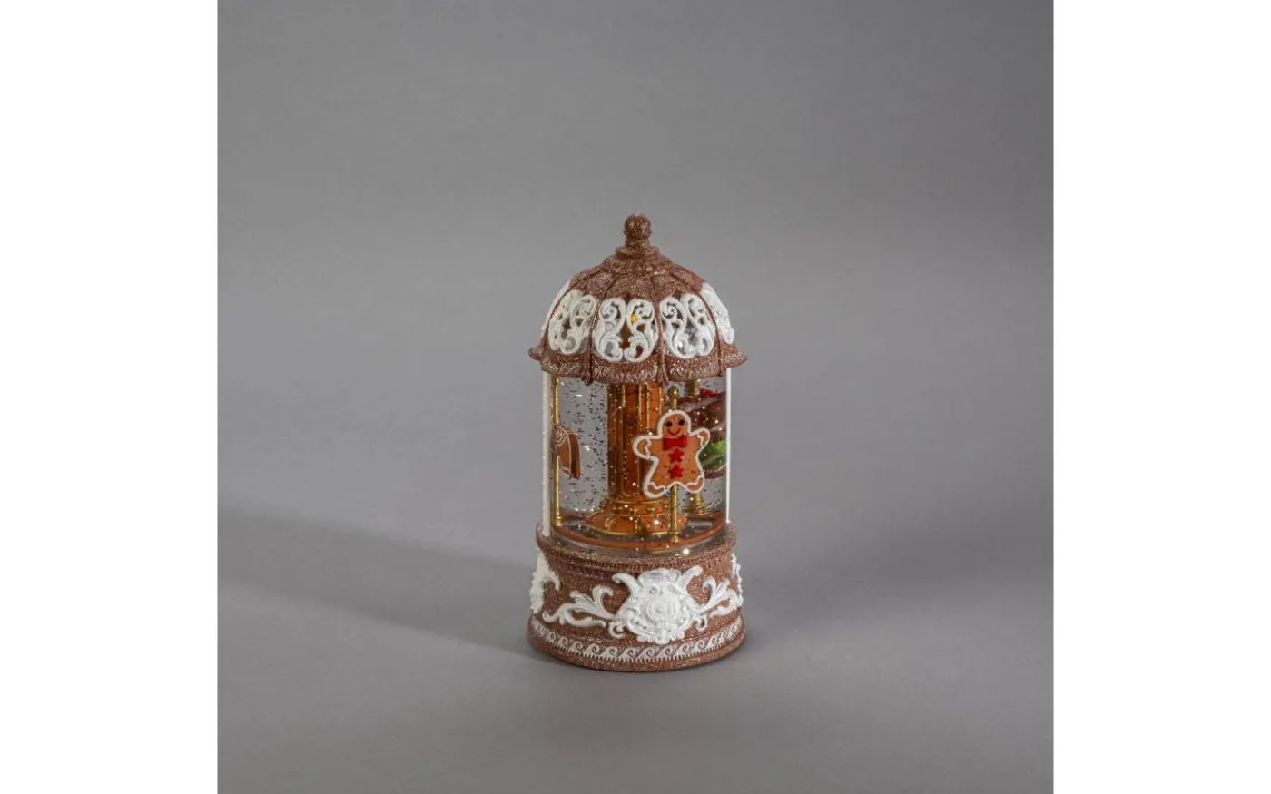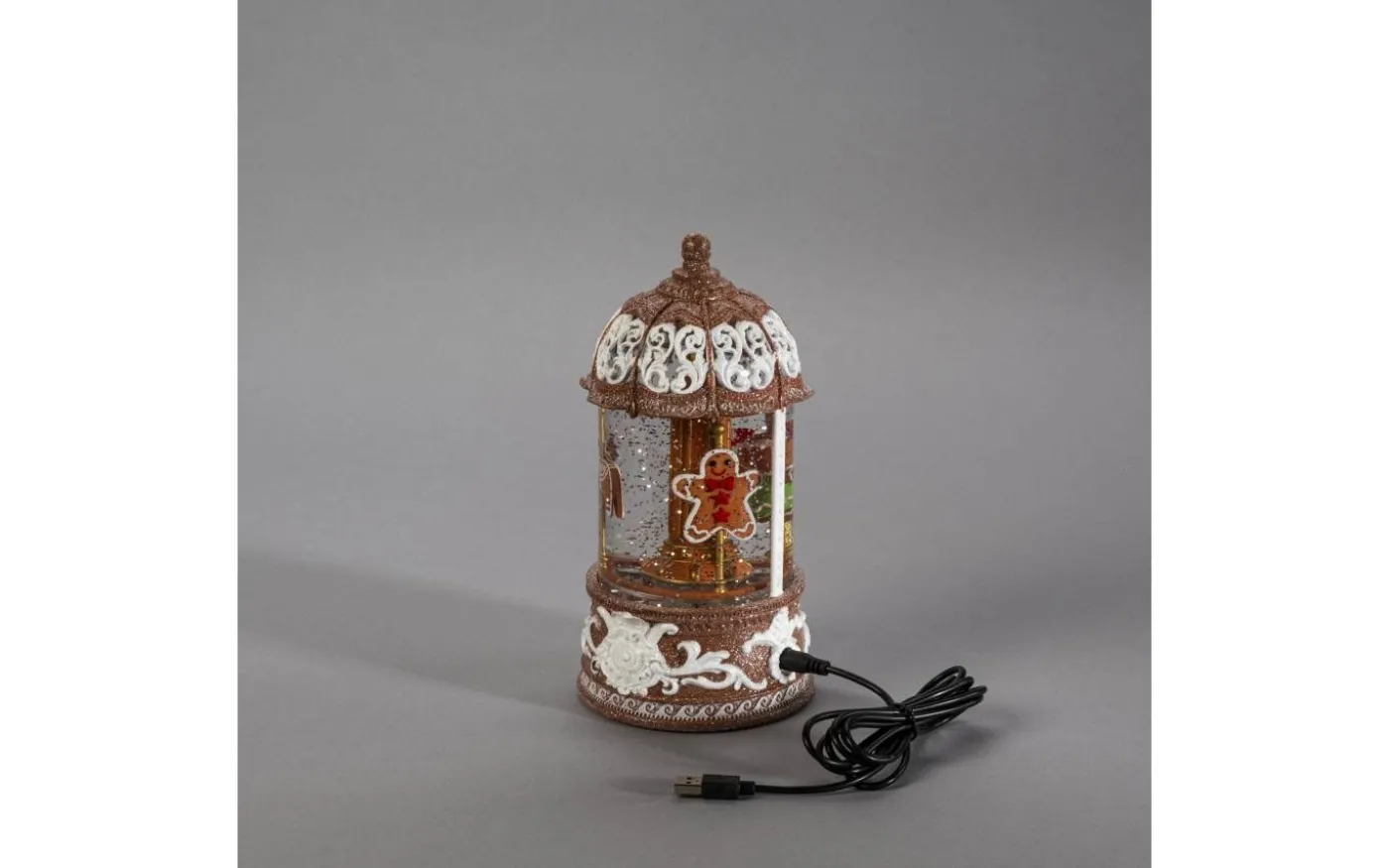 Pepparkakshus med roterande karusell. En vattenfylld snöglob med glada pepparkaksgubbar och virvlande glitter. Det varmvita LED-ljuset lyser upp huset och skapar en mysig julstämning. Perfekt i din julby eller som bordsdekoration. Med inbyggd timerfunktion (5h) och möjlighet till både batteri- och USB-drift är det enkelt att sprida julmagi – dag efter dag.