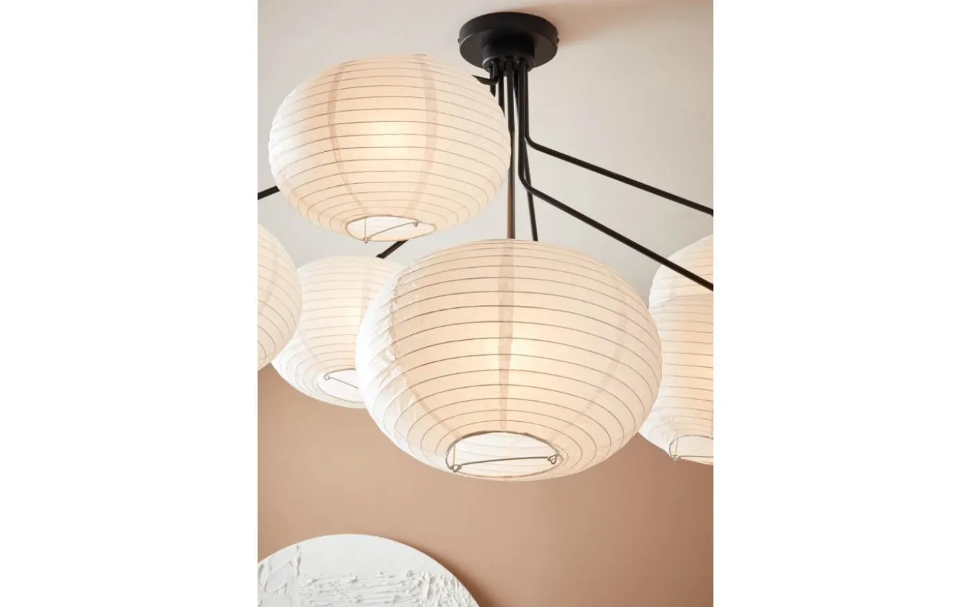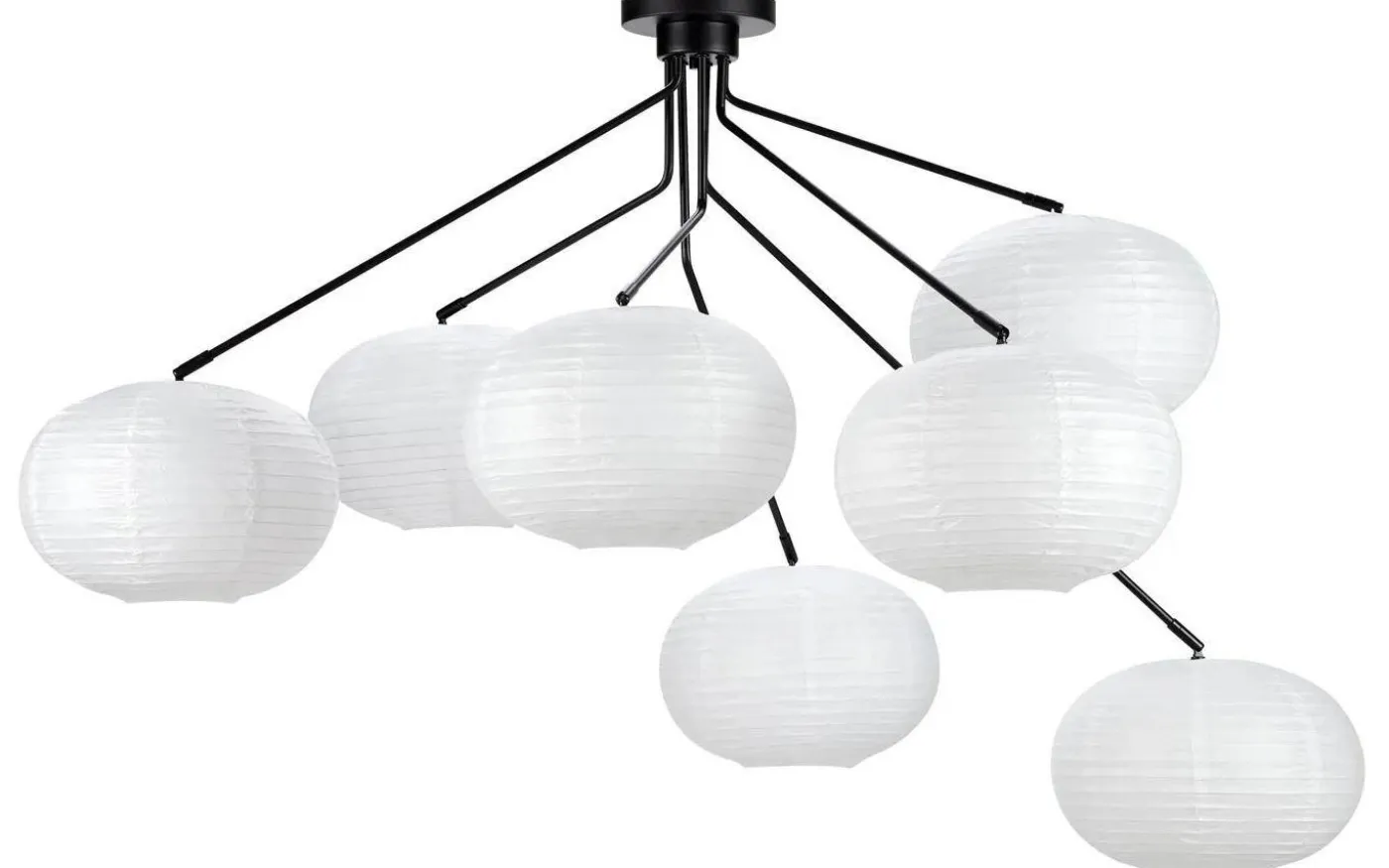 Härliga taklampan Galaxy, från välkända Markslöjd, är en taklampa med stomme i svart metall och sju skärmar i vitt rispapper. De skira skärmarna i rispapp släpper genom ett mjukt och mysigt ljusflöde.