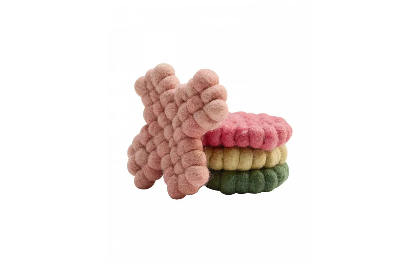 Glasunderlägg i ull med tovade bollar, för att skydda bordet mot varma koppar. Varje underlägg är 10cm i diameter. Säljs som 4-pack. Handtvätt Klorblekmedel får ej användas Kan ej torktumlas Kan ej strykas Kan ej kemtvättas