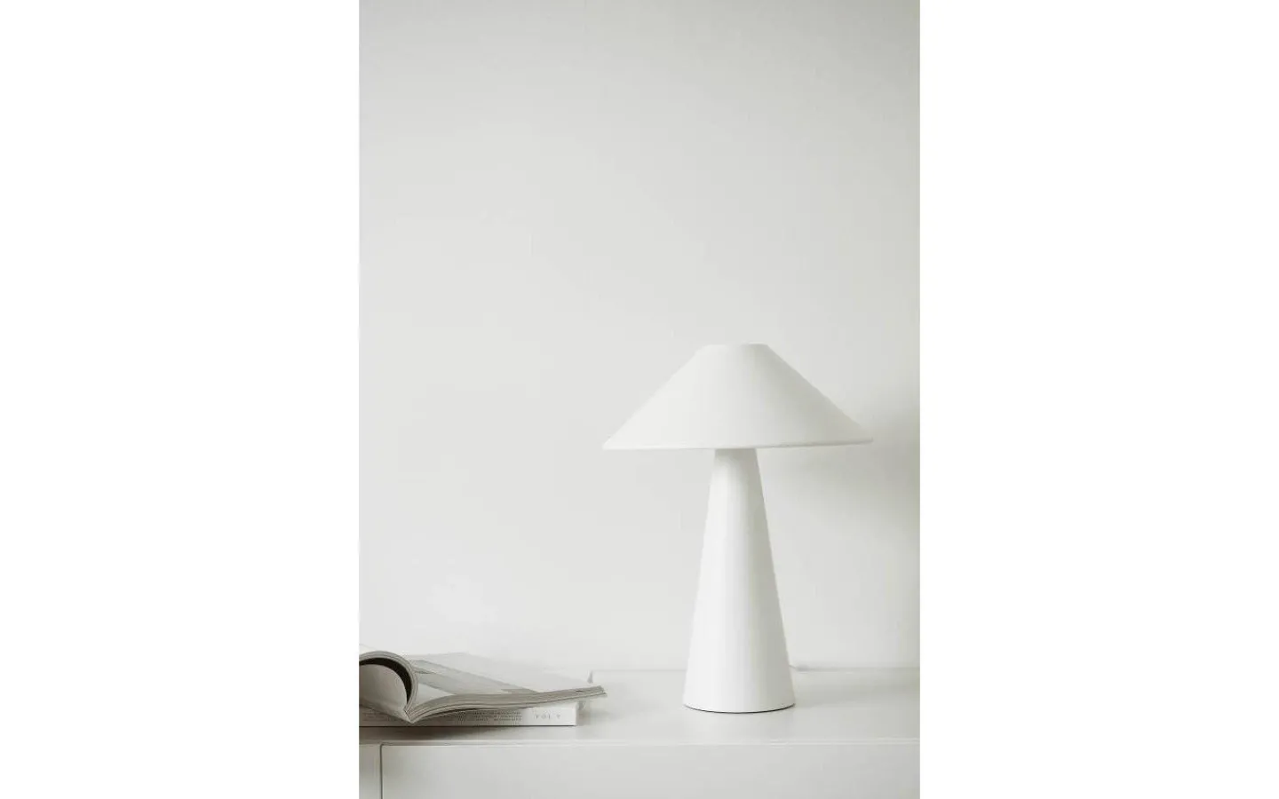 Stilrena bordslampan Cannes är designad av formgivaren Patrick Hall för välkända varumärket Globen Lighting. Både lampa och skärm är gjorda i metall och har en mattvit finish som avger ett sobert och lyxigt intryck.