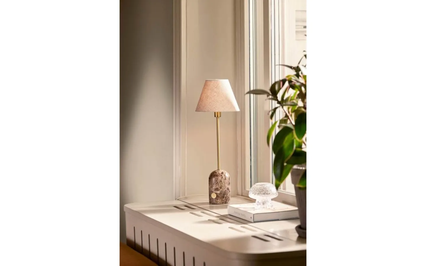 Gino från Globen Lighting är en elegant bordslampa med en exklusiv fot i solid sten, vackert kombinerad med detaljer i äkta mässing. Den stilrena linneskärmen ger ett mjukt och behagligt sken. Lampan har en smidig touchbrytare i mässing placerad på lampfoten.