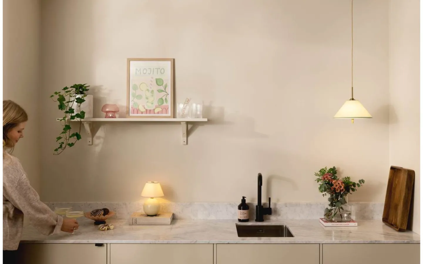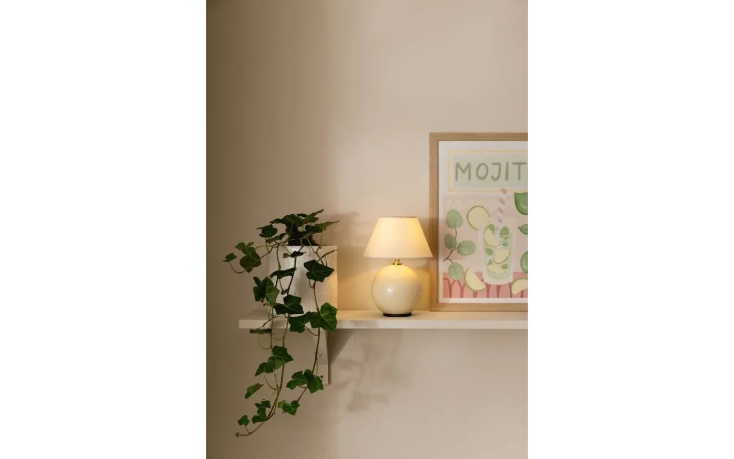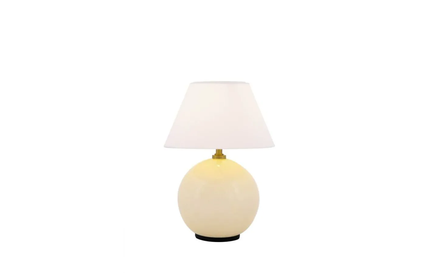 Iris från Globen Lighting är en uppladdningsbar bordslampa med färgstark personlighet. Den har en rund lampfot i färgat glas med dekorativa luftbubblor och en matchande tygskärm i bomull. Varje lampa är unik tack vare glasets bubblor.