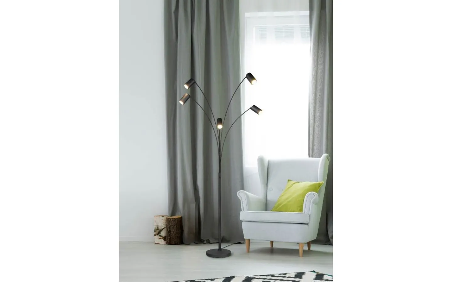 Den minimalistiska inredningstrenden blir alltmer populär och skapar en lugnande och harmonisk miljö. De rena linjerna och den minimalistiska designen hos den fristående armaturen MARLEY fokuserar ljuset och skapar stämningsfulla ljusaccenter. De fem lamphuvudena är rörliga och kan justeras fritt. Oavsett om den används som läslampa bredvid soffan eller som ljuskälla i hallen, skapar golvlampan en perfekt plats för speciella platser. Den mattsvarta färgsättningen skapar snygga kontraster i enkla bostadsutrymmen. För modern och pålitlig belysning rekommenderas en LED-lampa. Den erbjuder hög ljuskvalitet, är mångsidig och övertygar med en jämn belysning. Dess långa livslängd och låga värmeutveckling gör den till det perfekta valet för en mängd olika användningsområden. Ljuskälla: exklusiv 5x GU10 · max. 10W. Extra information: IP20, Lampa(or) ingår ej, Strömbrytare