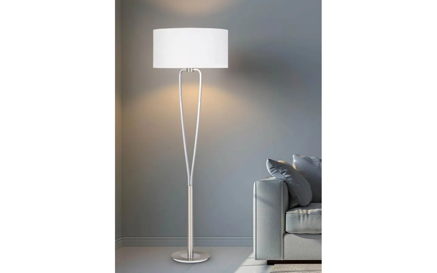 Den högkvalitativa golvlampan PARIS II har en modern design och skapar en mysig atmosfär. Den borstade nickelbasen och den tvådelade kromskaftet kombineras med en vit skärm av elegant tyg. Strömbrytaren för att tända och släcka golvlampan sitter under skärmhållaren och lampan har en höjd på 160 cm och skärmen har en diameter på 35 cm. E27-sockeln kan utrustas med en valfri ljuskälla med en maximal effekt på 60 watt. Ljuskälla: exklusivt 1x E27 · max. 60W. Extra information: IP20, Lampa(or) ingår ej, Strömbrytare