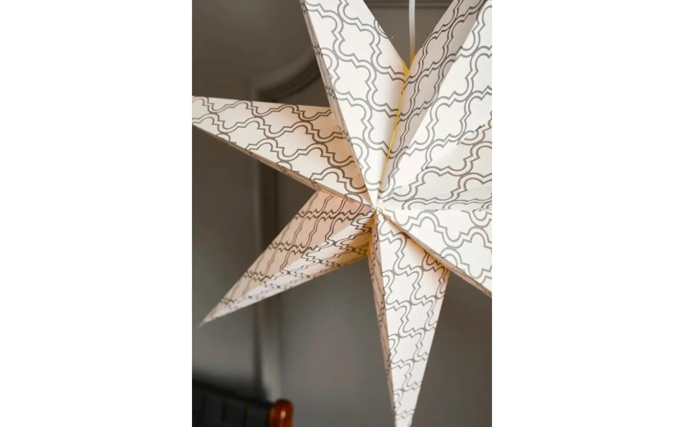 Stor julstjärna i papper. Snyggt mönster i grått och vitt. Diameter på 75cm. Vi rekommenderar: Julstjärna med grafiskt mönster. Passar bra i det moderna hemmet. Tekniskt: Lampan kräver en glödlampa med liten sockel (E14) om max 25W eller motsvarande i LED, ingår ej. 3,5m sladd med strömbytare och takkrok ingår.