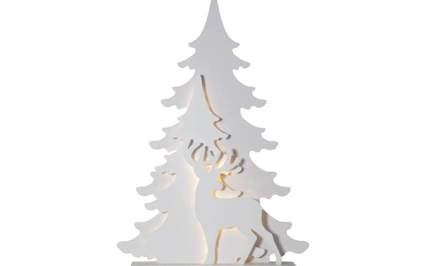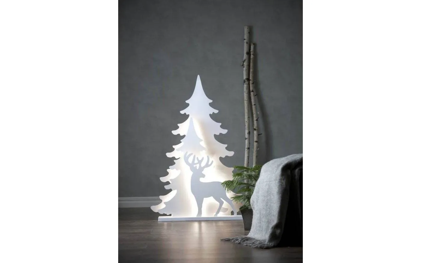 Vacker juldekoration i trä med silhuetter som avbildar en hjort och två granar. Mellan silhuetterna lyser ett behagligt ljus som ger en otroligt vacker effekt. Med sin höjd på 110 cm passar denna dekoration perfekt till dig som har stora fönster eller till dig som helt enkelt vill ha en pampig juldekoration ståendes direkt på golvet.