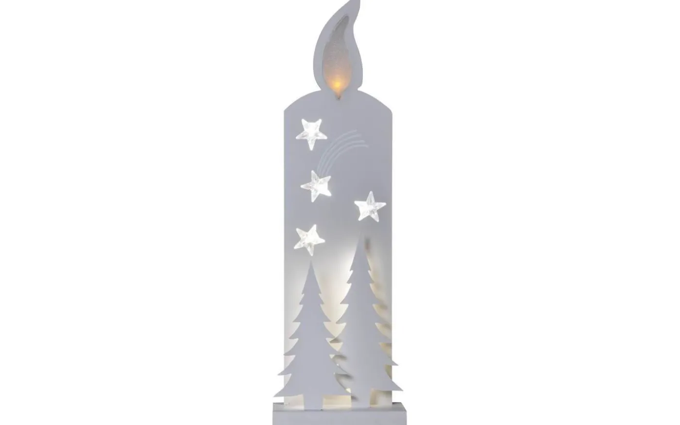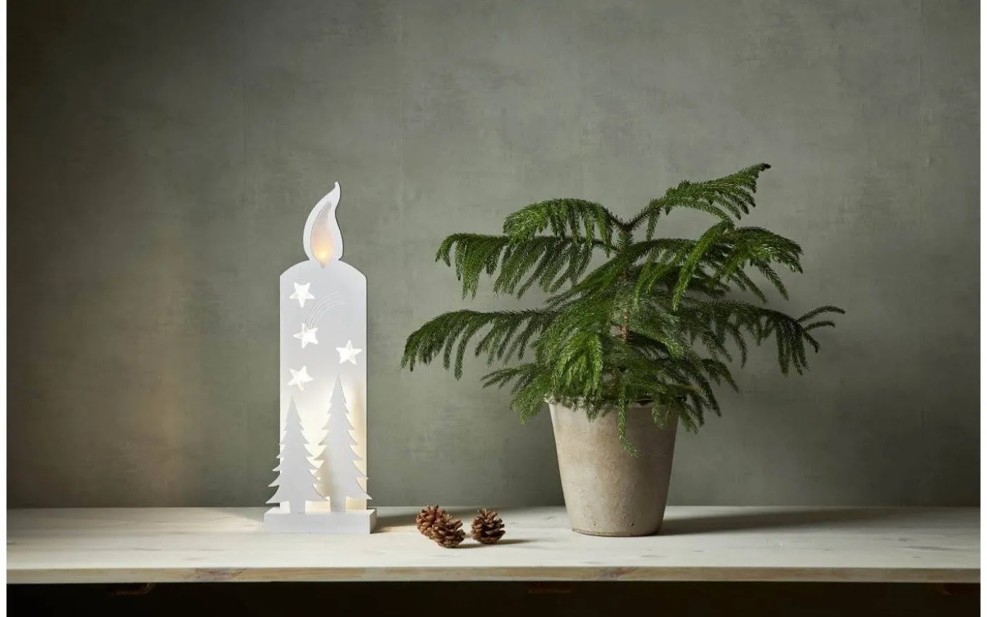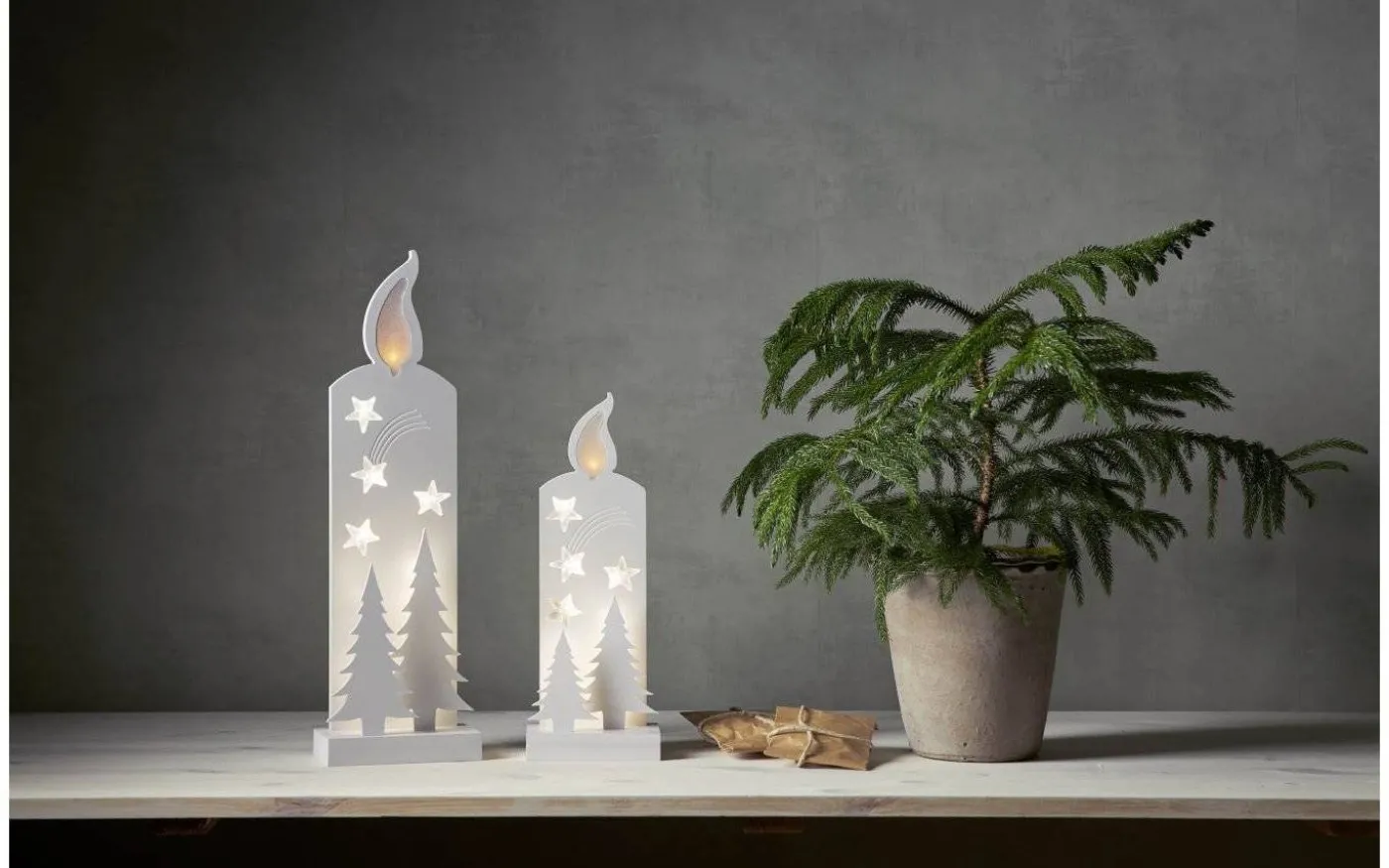 Grandy Siluett Blockljus, från Star Trading, är en 50cm hög, vacker bordsdekoration med silhuetter av granar och ett stort blockljus. Med vackra ljuspunkter som lyser upp blockljusets låga, stjärnorna och bakom granarna blir denna dekoration något extra till jul. Placera på sidobordet, i fönsterkarmen eller varför inte på nattduksbordet under vintertid för att skapa en härlig julkänsla.