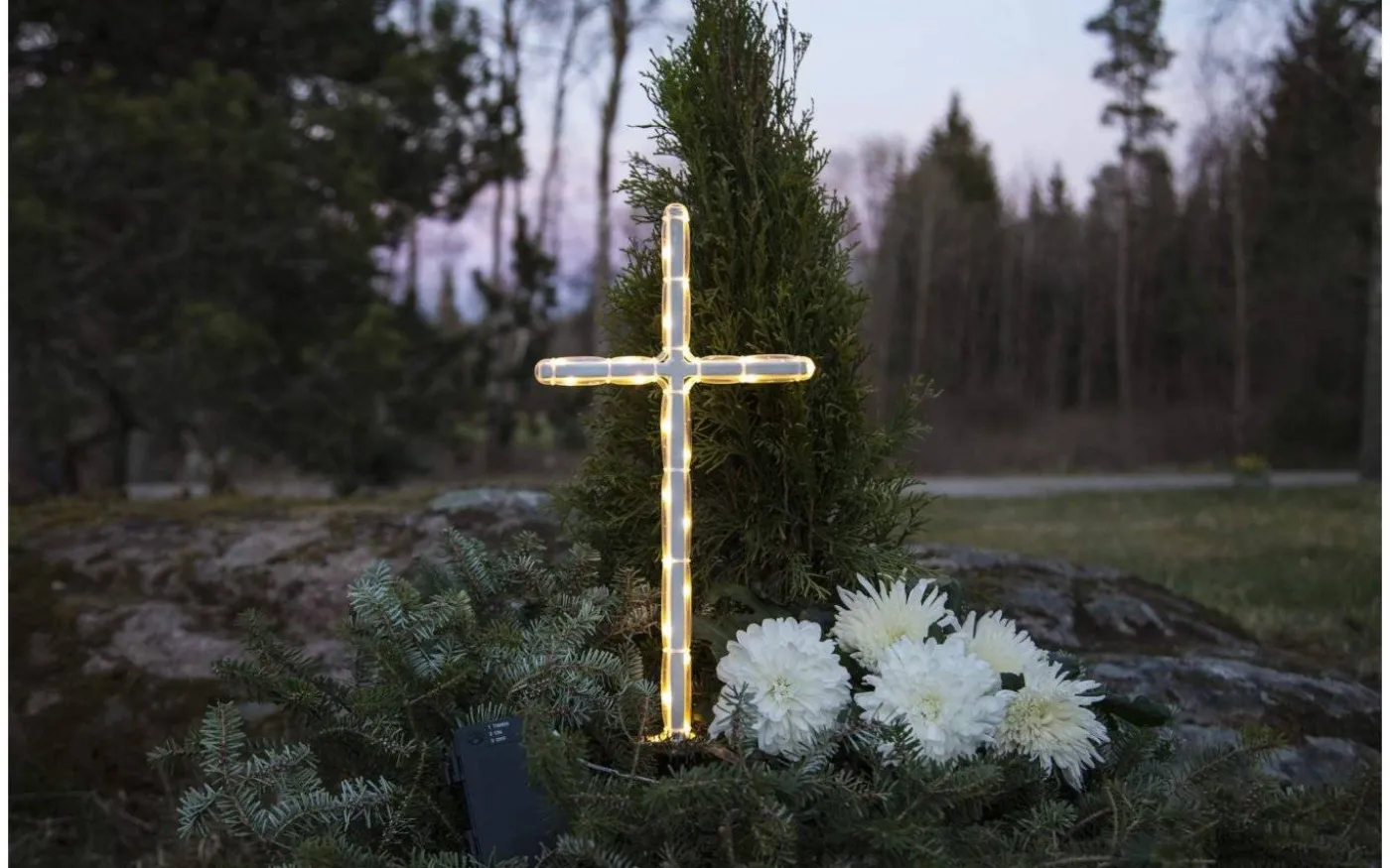 Detta fina kors från Star Trading kan bli en extra fin liten detalj vid graven eller i trädgården. Korset är format med ropelight som lyser upp i ett härligt varmvitt ljussken.
