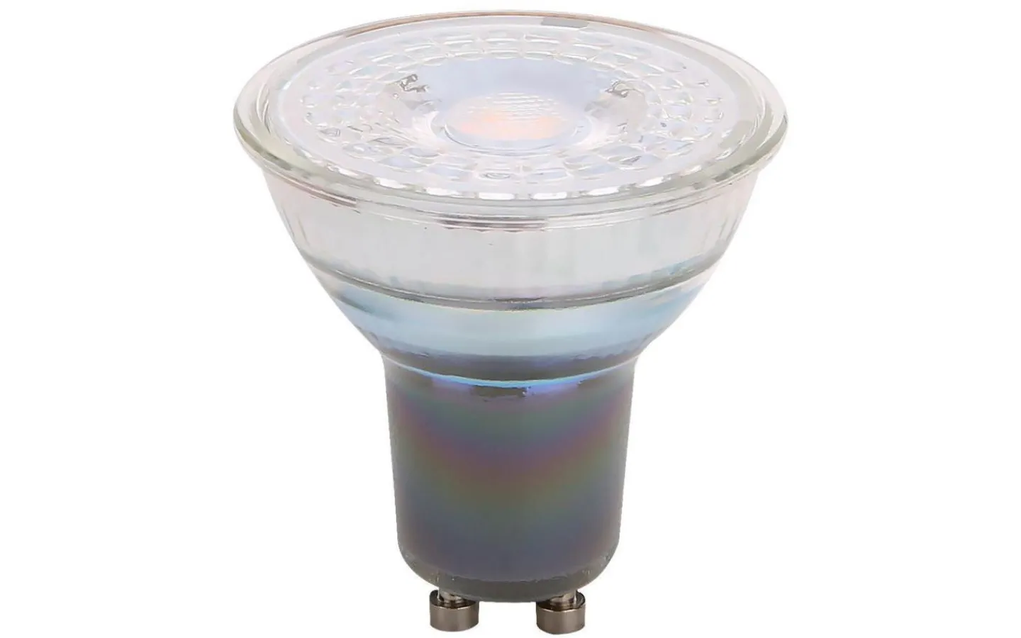Dimbar spotlight LED med GU10 sockel och varmvitt sken. Lamphöljet är transparent och är gjort i glas Färgtemperatur är på 2700K och spridningsvinkeln 38°.