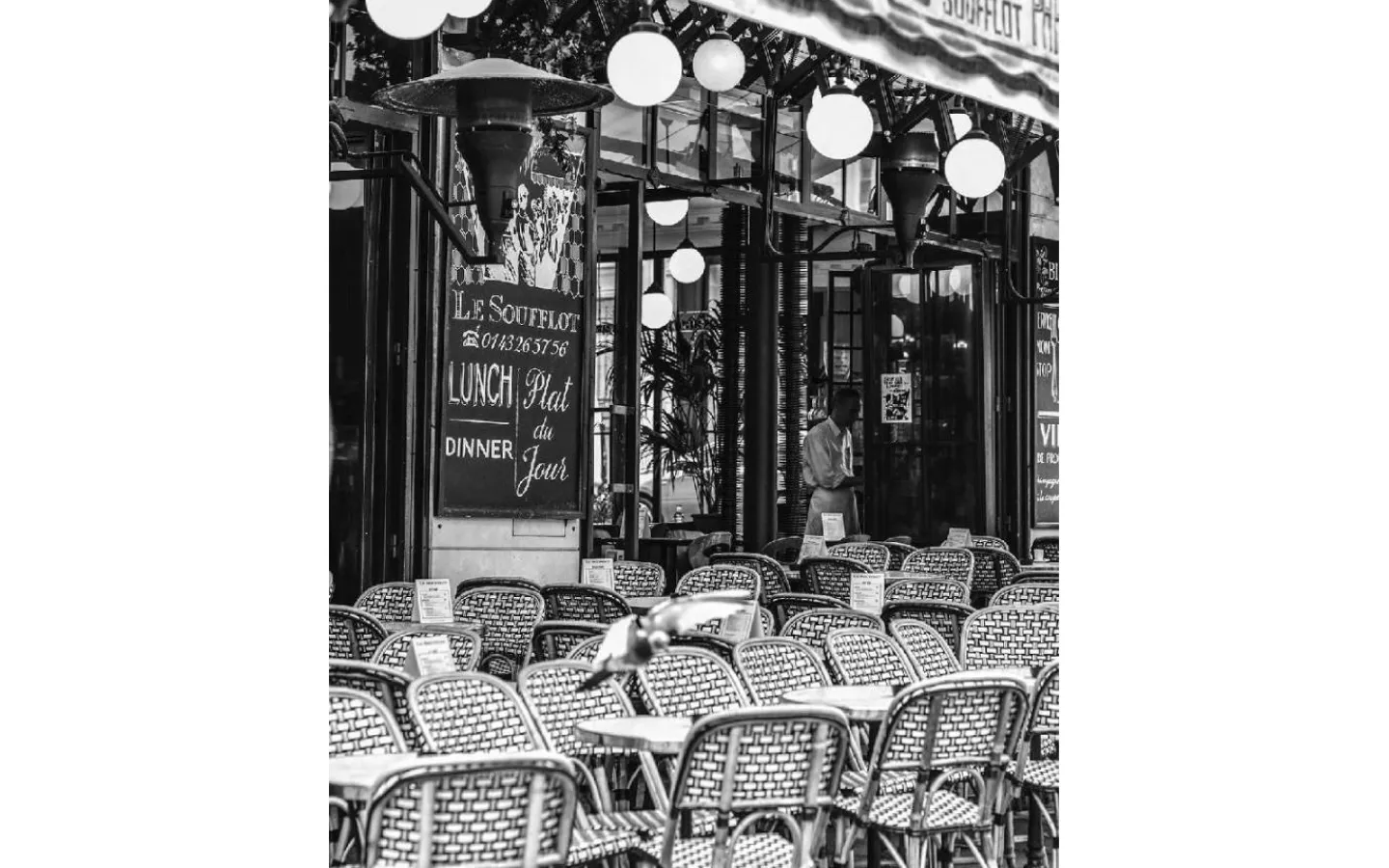 En stämningsfull svartvit plansch som fångar själen i det parisiska cafélivet. Bilden visar Le Soufflot, ett klassiskt brasserie i hjärtat av Paris, där både lokalbor och turister samlas för lunch eller en kvällsmåltid. De typiska rottingstolarna och de handskrivna menyerna bidrar till den genuina atmosfären som förknippas med stadens charmiga trottoarcaféer. Planschen mäter H70xB50cm och blir en tidlös hyllning till Paris unika kultur och vardagsliv.