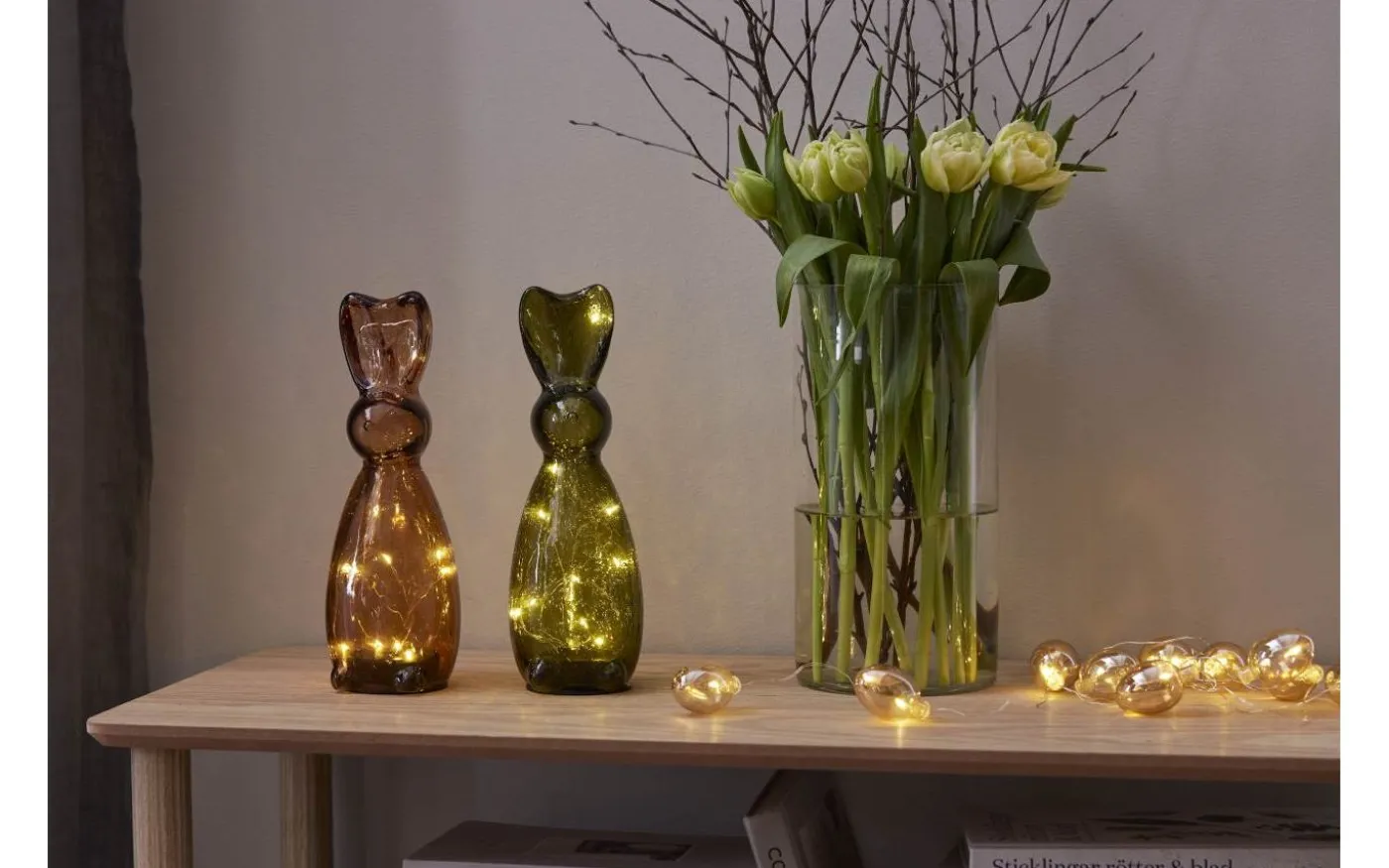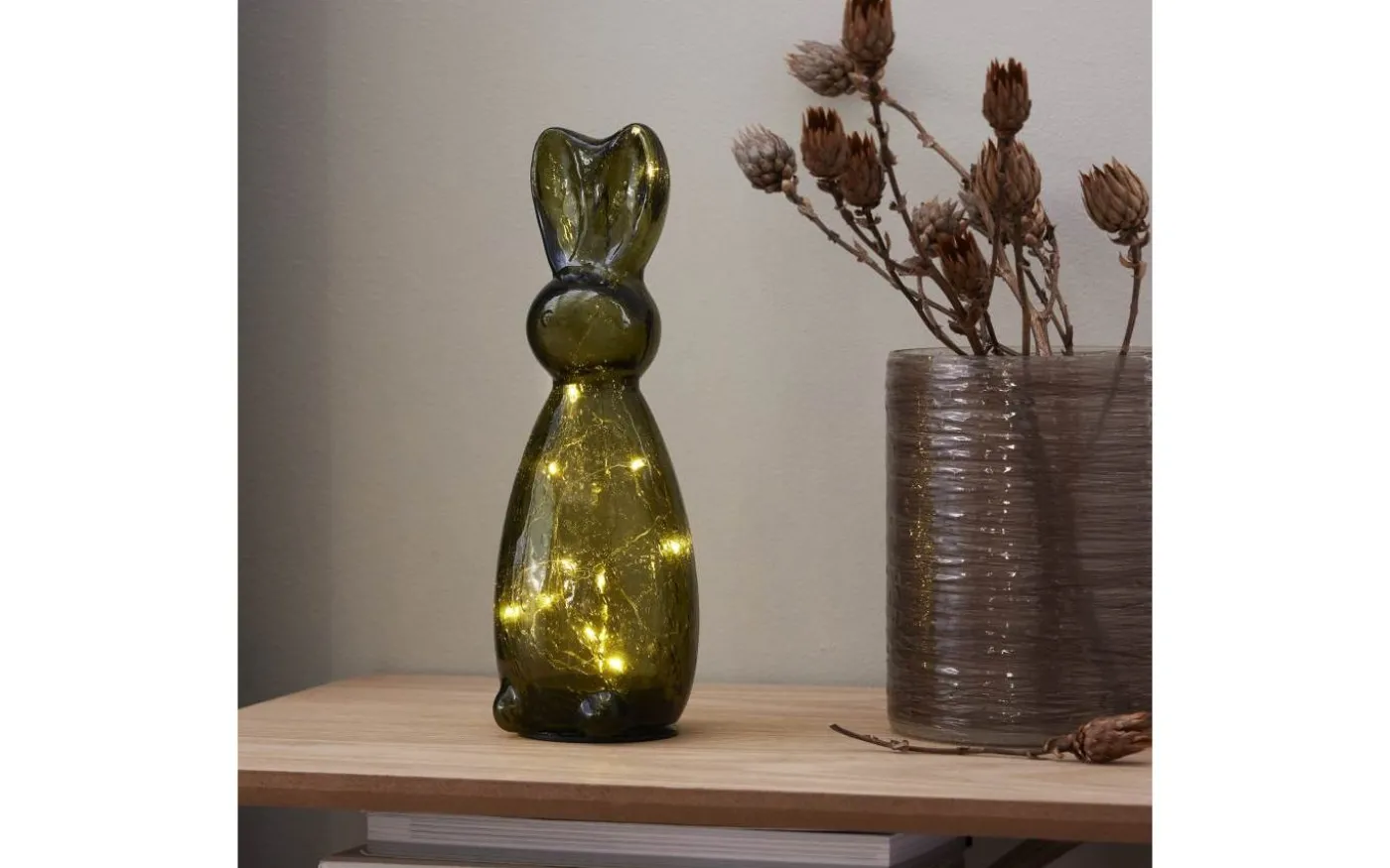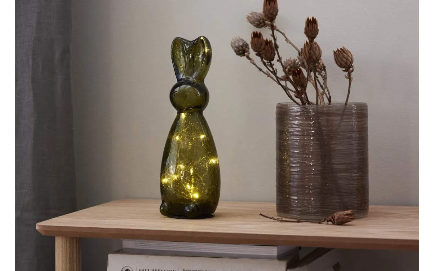 Stilfull bordsdekoration i mörkt grönt glas. Placeras på bord eller bänk och ger ett vacker sken. En fin dekoration för påskdukningen men passar att ha framme hela året. Batteridriven med timerfunktion för inomhusbruk. 2 batterier AAA ingår ej. Batteritid ca. 80h.