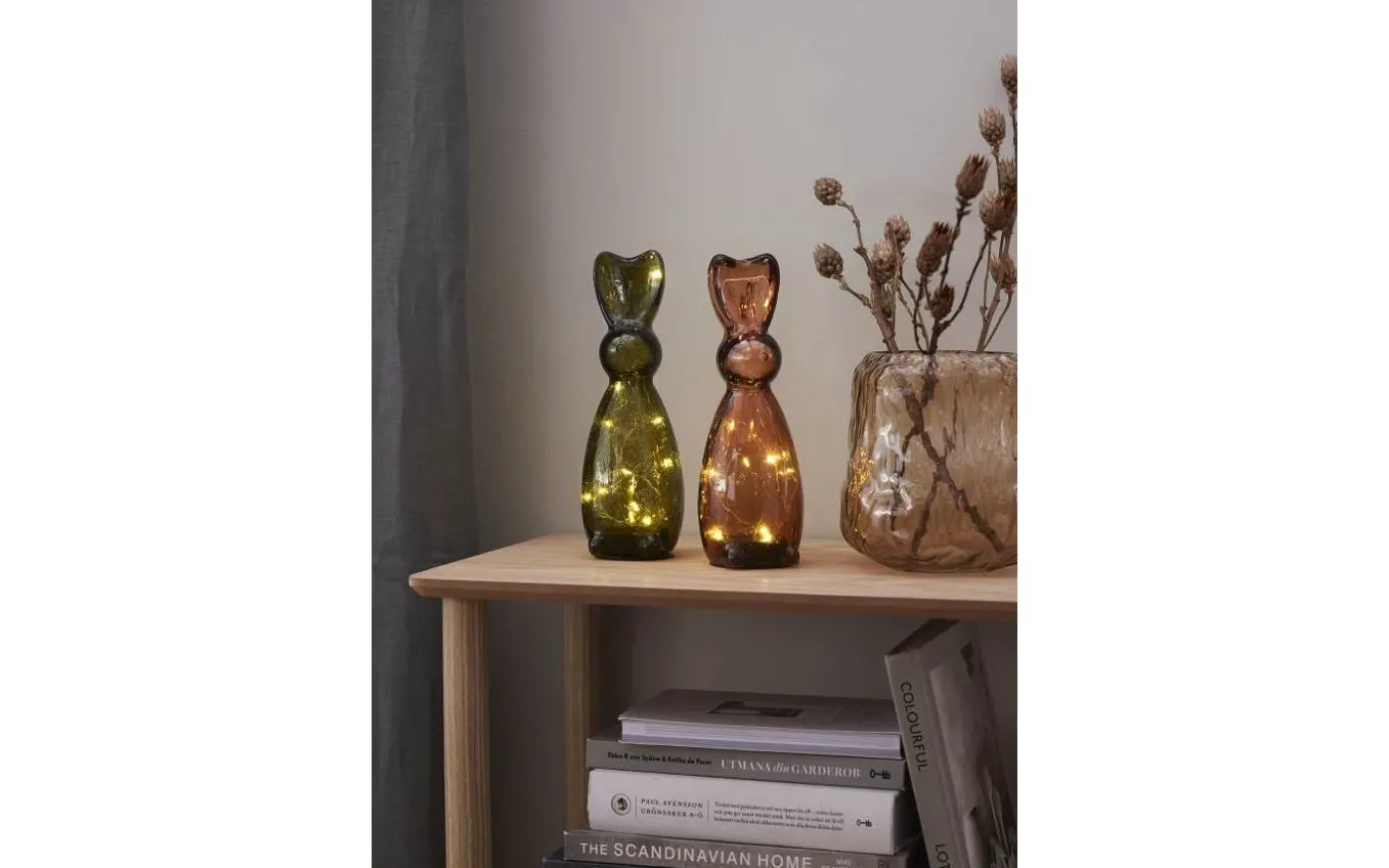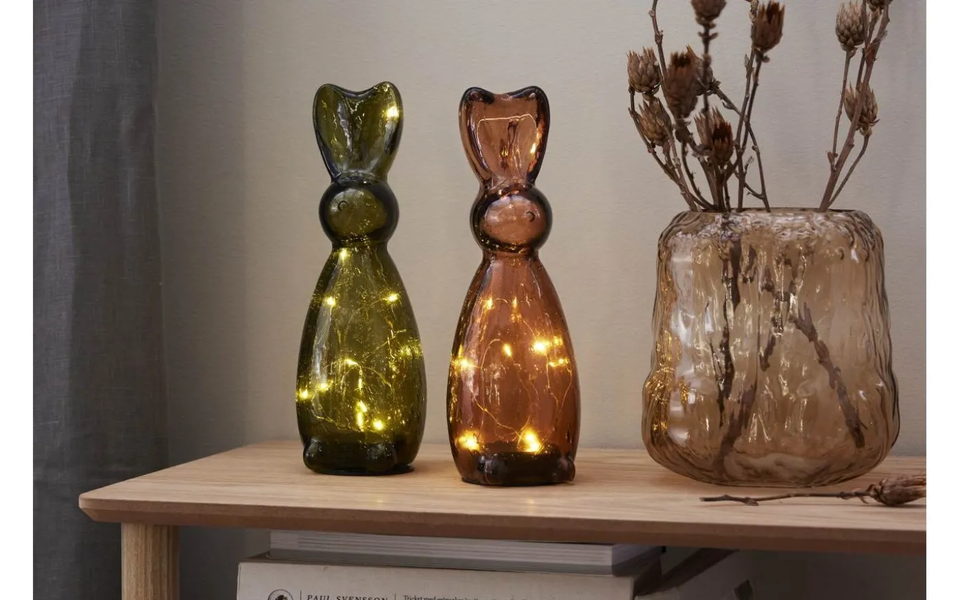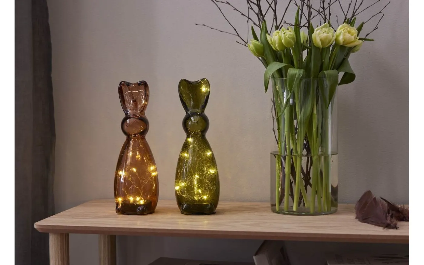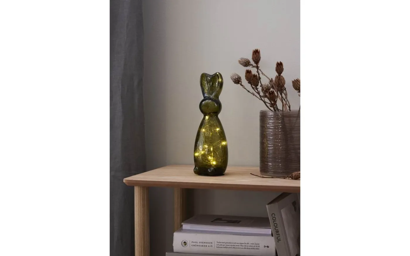 Stilfull bordsdekoration i mörkt grönt glas. Placeras på bord eller bänk och ger ett vacker sken. En fin dekoration för påskdukningen men passar att ha framme hela året. Batteridriven med timerfunktion för inomhusbruk. 2 batterier AAA ingår ej. Batteritid ca. 80h.