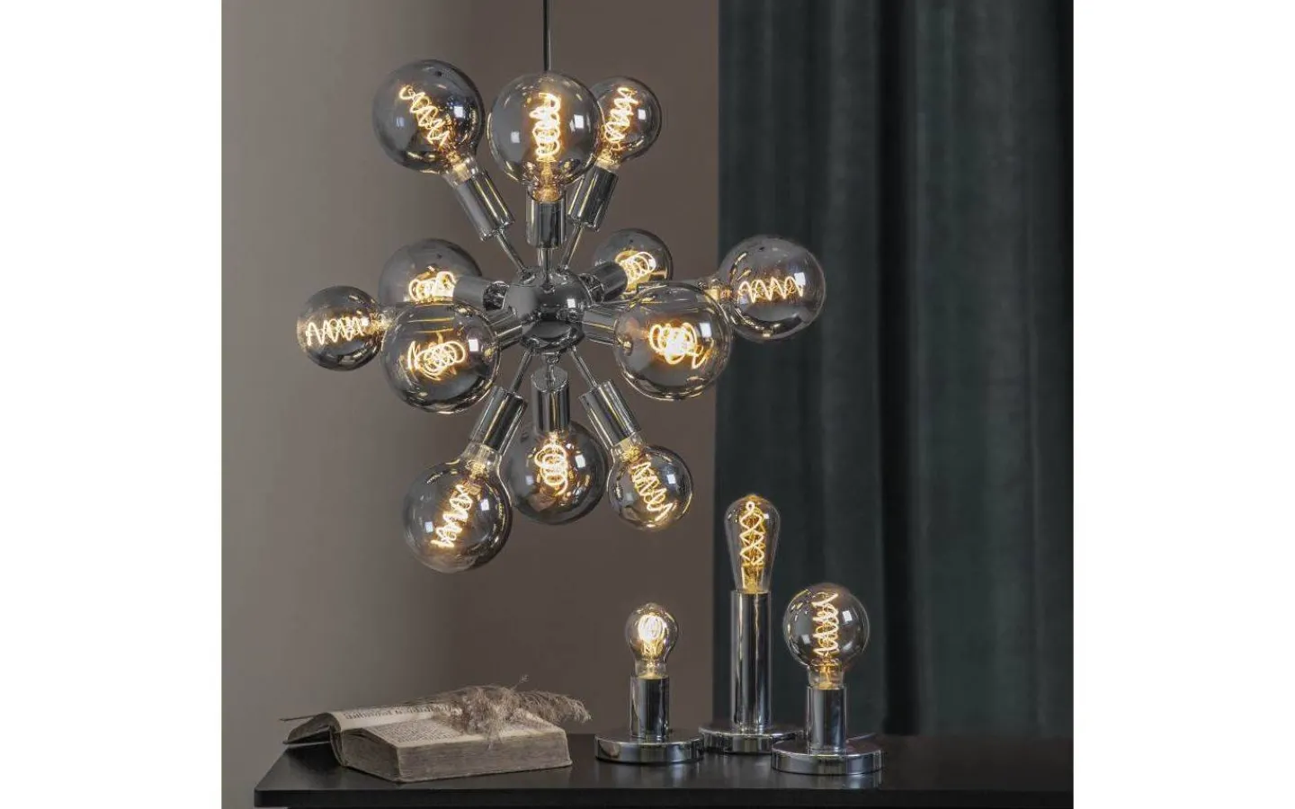 Ljuskälla med rökfärgat glas och en vackert formad spiral som sprider varmt och mjukt sken. Lampan är dimmerkompatibel och har E27-sockel.
