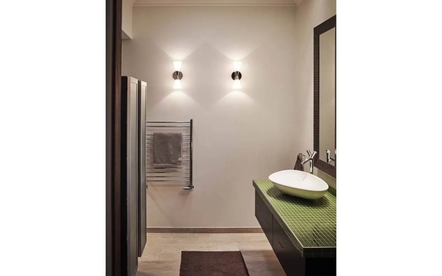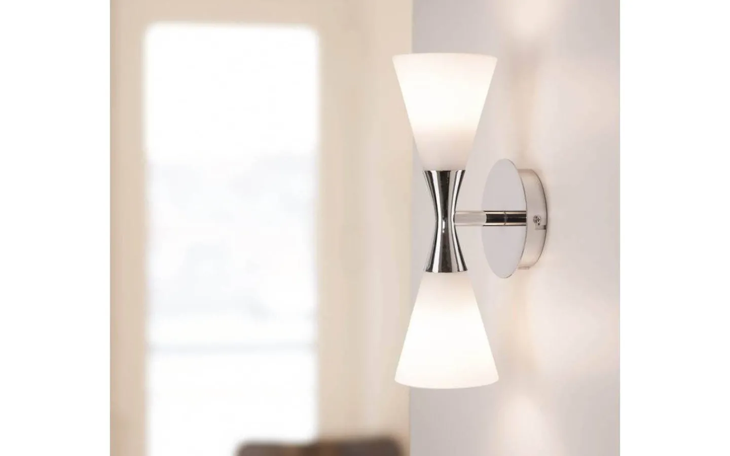 Eleganta Harlekin Duo, från danska Herstal, är en vacker vägglampa med stomme i blank krom metall med två opalvita glas som avger en form som påminner om ett timglas. Harlekin Duo passar precis lika bra intill en spegel i hallen, som i en trappa eller på väggen i vardagsrummet.