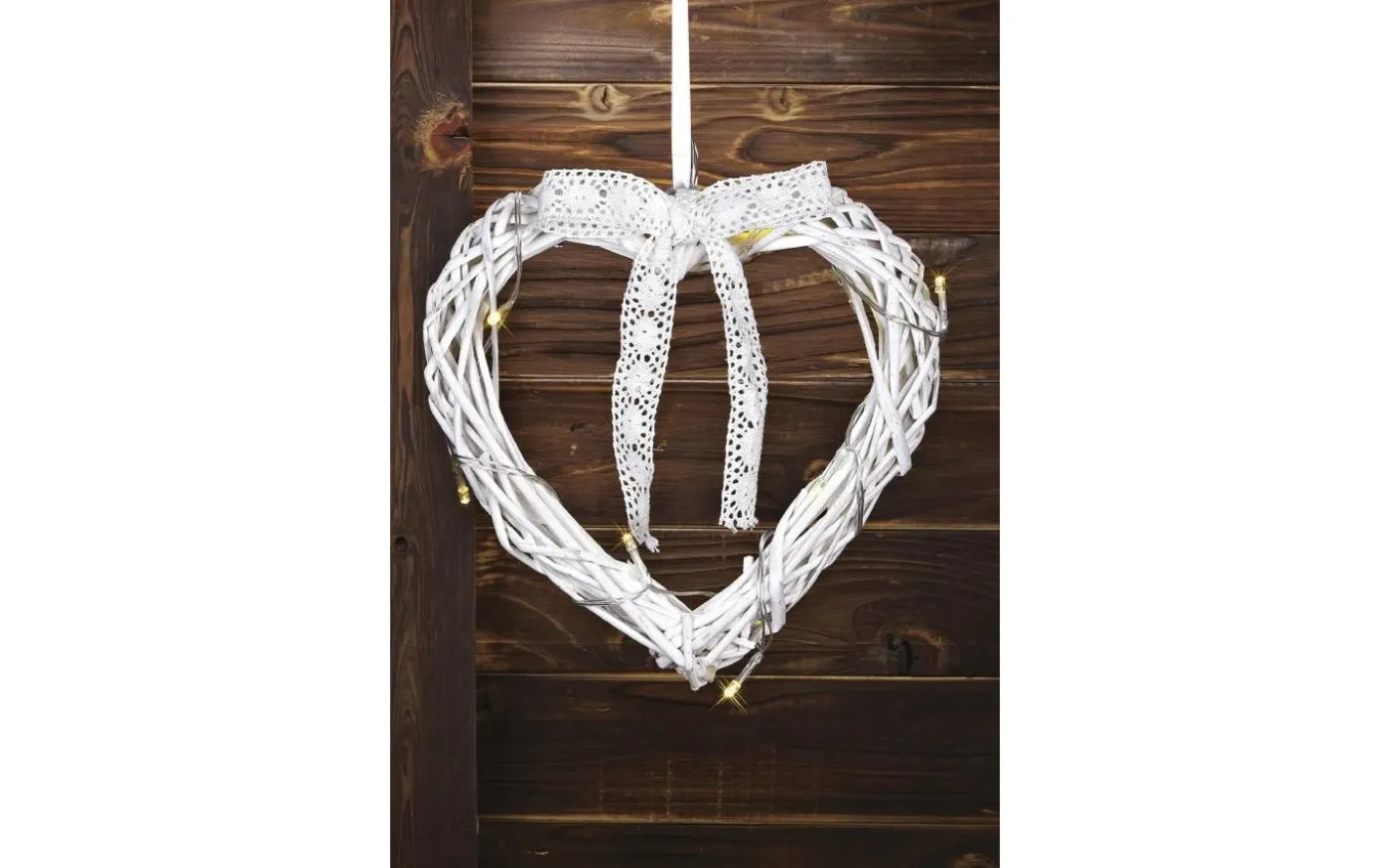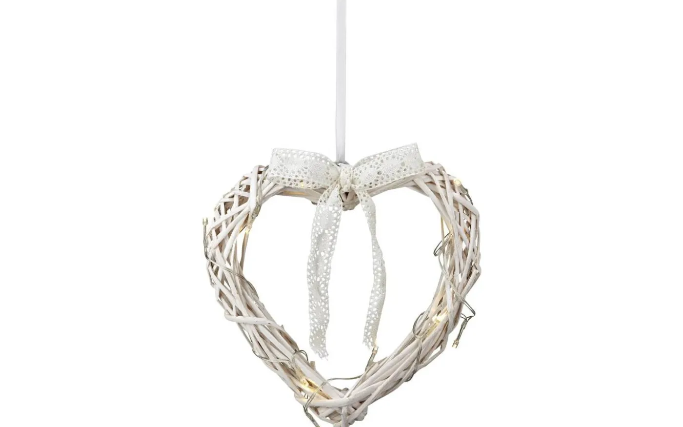 Rottingdekoration i form av ett hjärta. Runt hjärtat finns en virad LED-slinga med 15 dioder. Rosett av spetsband. Vi rekommenderar: Lättplacerad dekoration med batteridrift. Passar i hall eller i mindre fönster. Tekniskt: Hjärtat har fast LED-belysning om 0,9W. Drivs av 3st AA-batterier, ingår ej. Timer.