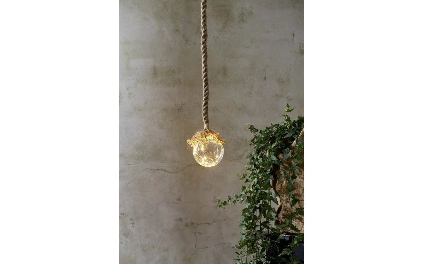 Batteridriven glaskula med dew drop och juterep. Dekorationen avger ett vackert sken. Den inbyggda timern gör det lätt att ställa in när produkten ska lysa.