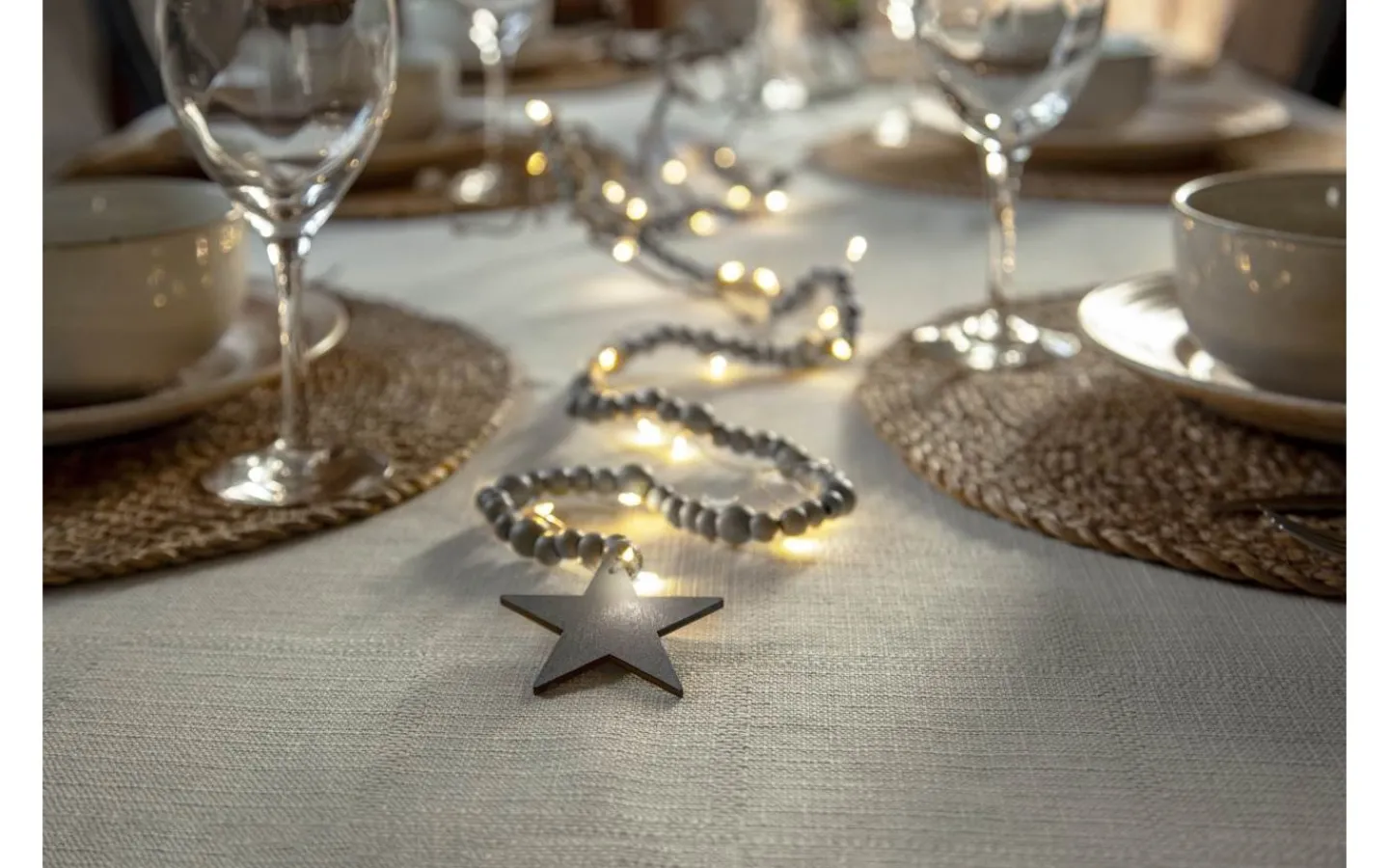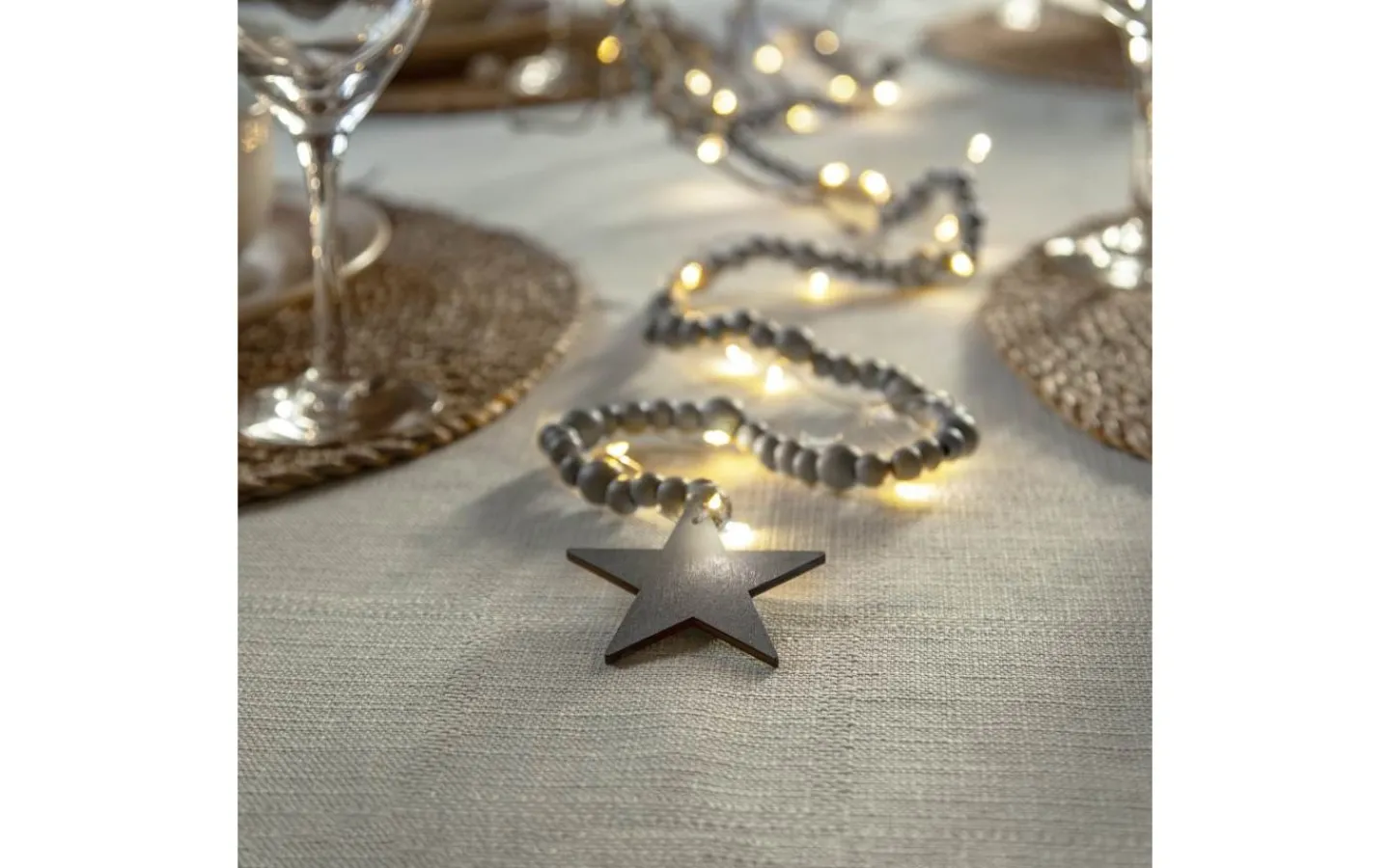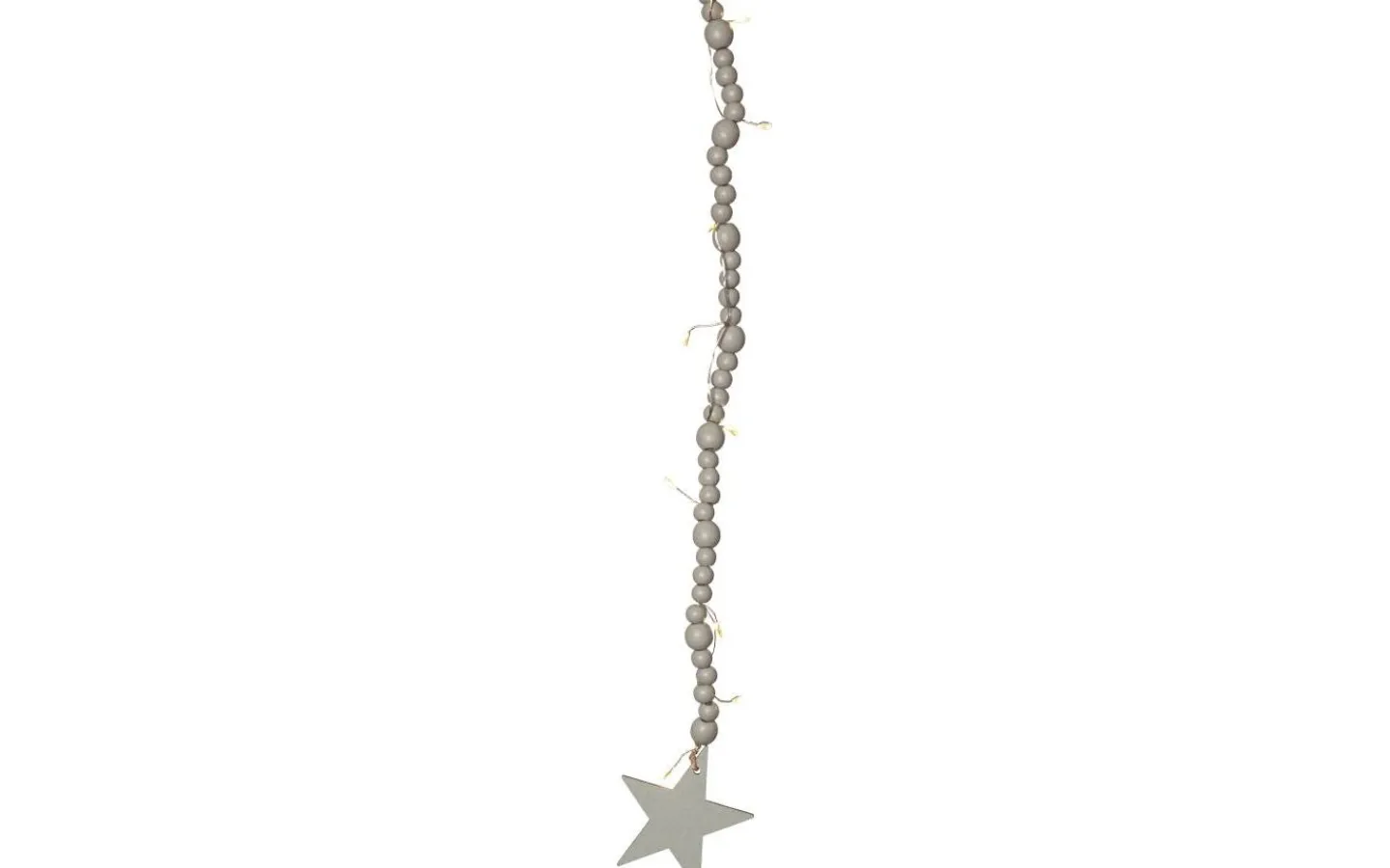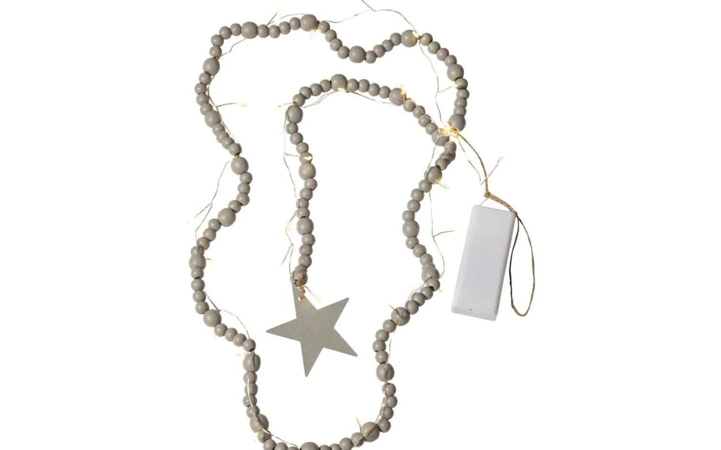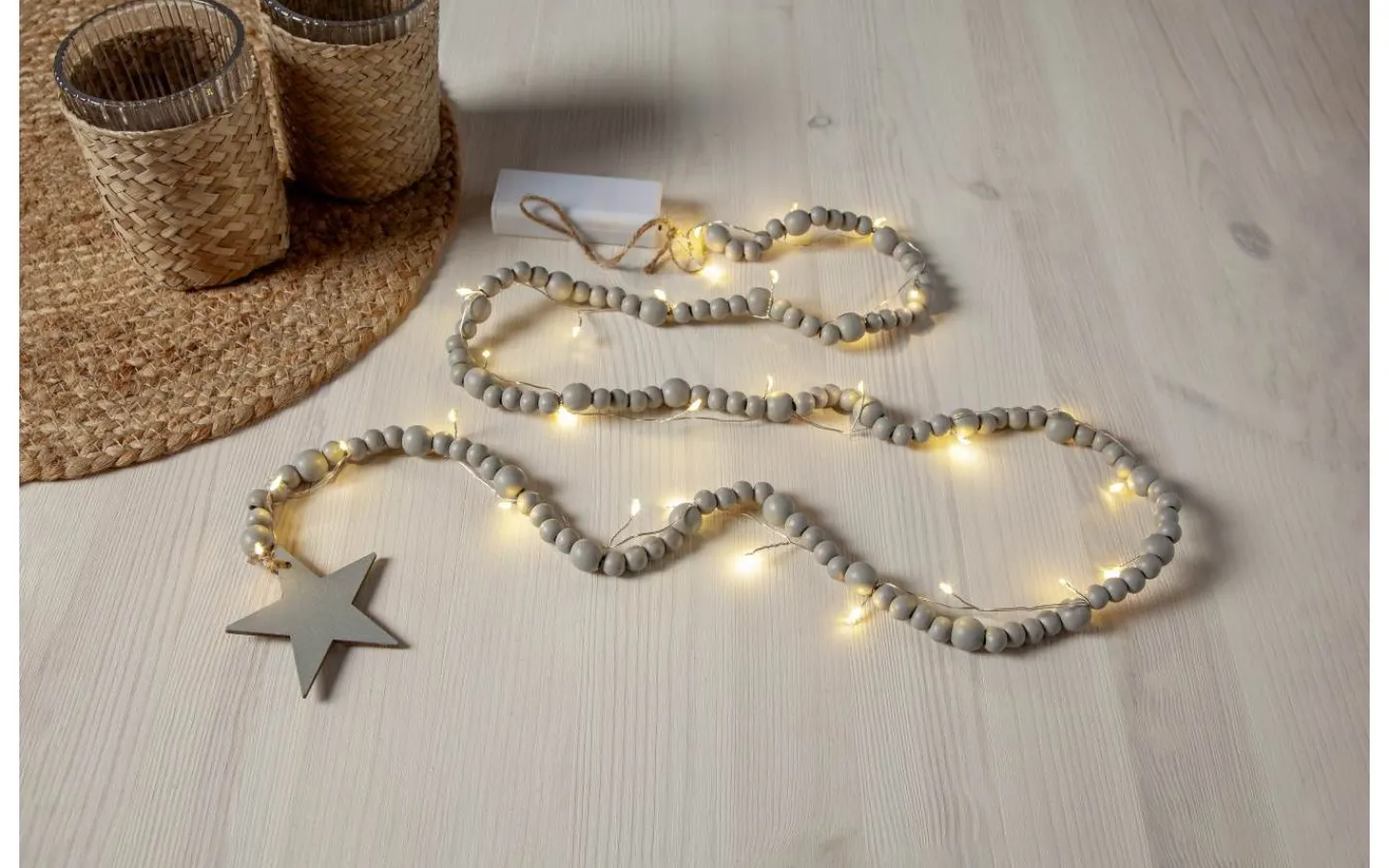 Exklusiv ljusslinga för inomhusbruk med träpärlor. Greige färg som matchar våra ljusstakar i beige. Tunn metallslinga med 30 varmvita LED virad runt pärlorna ger ett vackert sken, passar till bordsdekoration och julgransdekoration. Batteribox med timerfunktion. 2 batterier AA ingår ej. Batteritid ca. 80h.