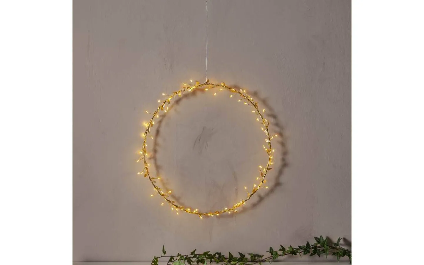 Winny från Star Trading är en vacker och stämningsfull krans med guldfärgade löv i polyester. Kransen är försedd med 80st små LED-lampor som lyser i ett härligt varmvitt ljussken.