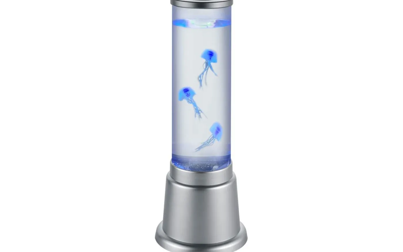 LED-vattenpelaren JELLY – inredningsaccessoar och belysning i ett. Så snart pelaren tänds börjar de små maneterna röra sig i den klara vätskan. Den inbyggda RGB-färgväxlaren gör att pelaren kan anta olika färger och skapar ett ljusspel i ditt vardagsrum. Vattenpelaren står på en titanfärgad plastbas och har en höjd på 36 cm och en diameter på 12,5 cm. Ljuskälla: inklusive 1x SMD LED, 6W · 1x 5lm, —. Extra information: Kabelbrytare, RGB-färgväxlande