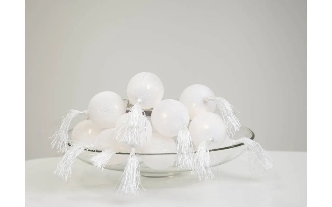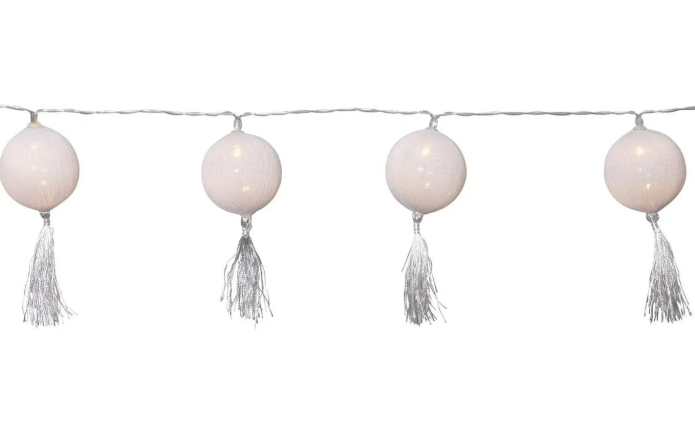 Batteridriven ljusslinga med söta tassels att dekorera barnrummet med. Ljuslingan har 10 st tassels som lyser med ett varmvitt ljus och slingan är 135 cm lång.